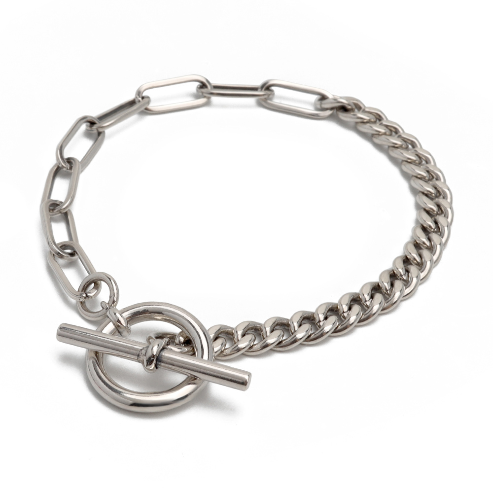 喜平と小豆のコンビチェーンを使用したブレスレット。マンテルデザインが、女性らしさを加えてくれます。バランスの取れた万能アイテム。