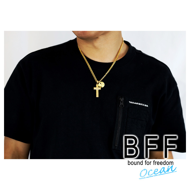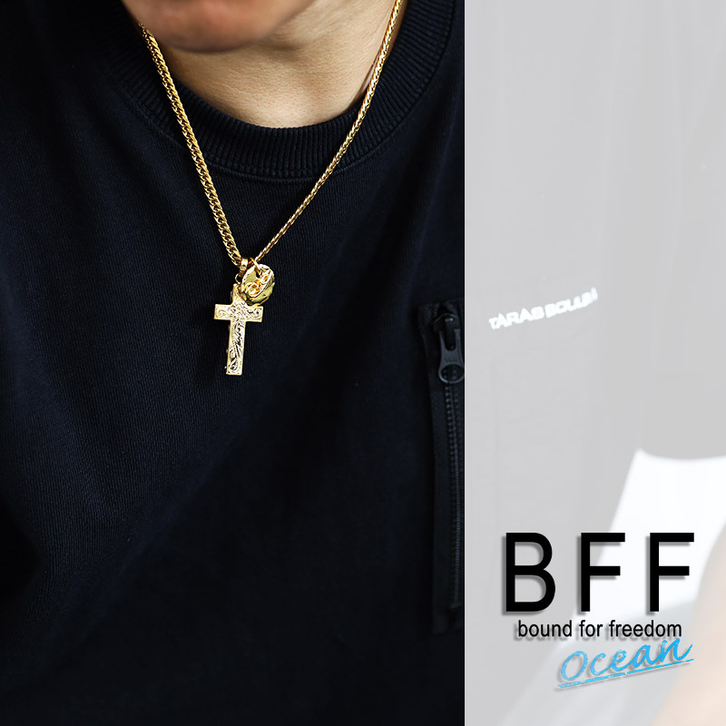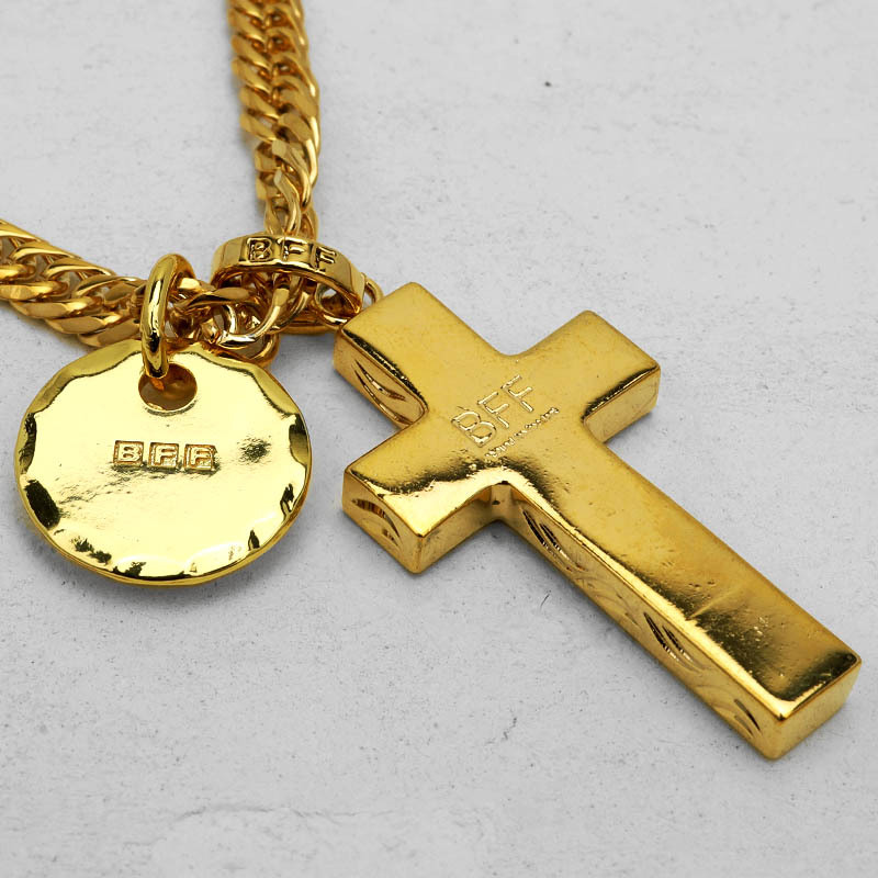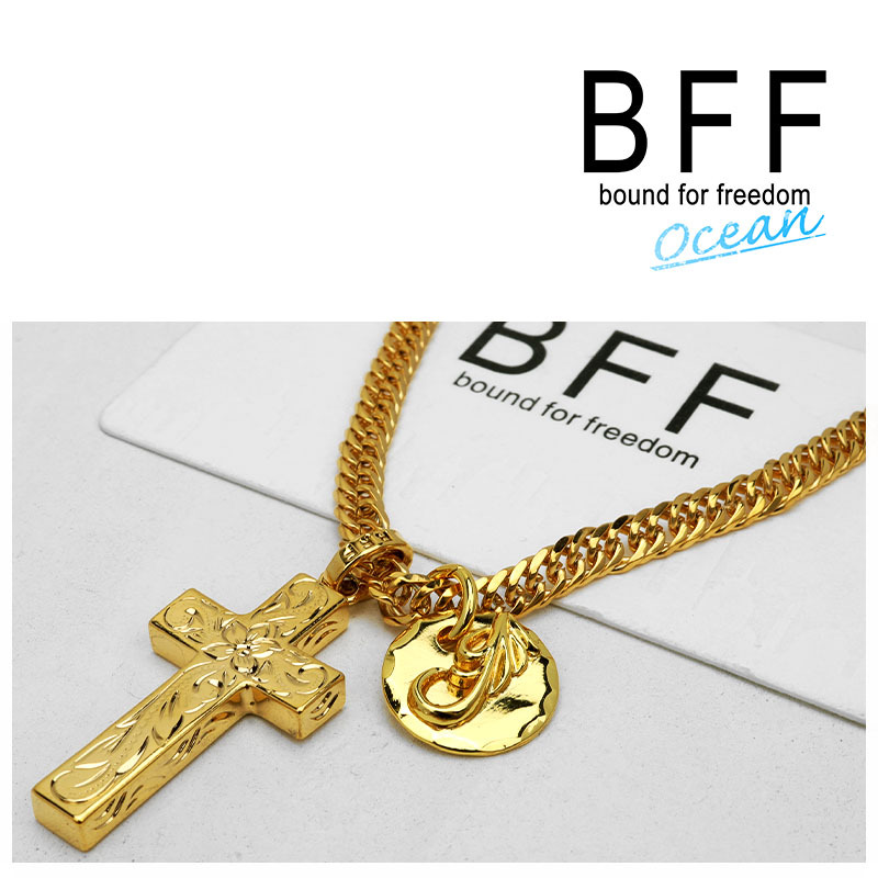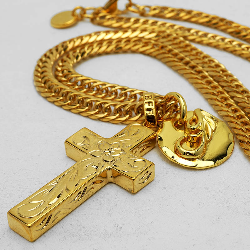BFF ブランド クロスネックレス ダブル喜平 6面カット 唐草 ステンレス ゴールド 18K GP 金色 専用BOX付属
