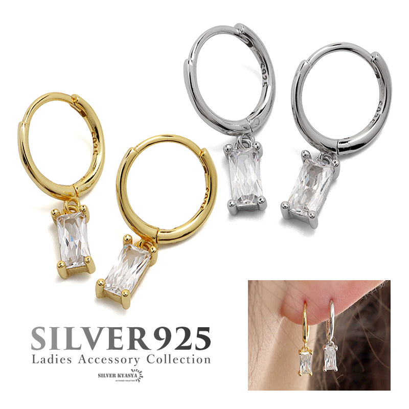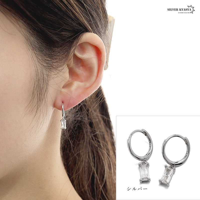 スクエア型のキュービックジルコニアが揺れるドロップピアス。透き通るようなホワイトカラーのストーンがピュアで女性らしい雰囲気を演出します。