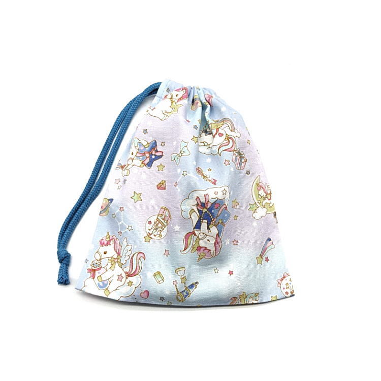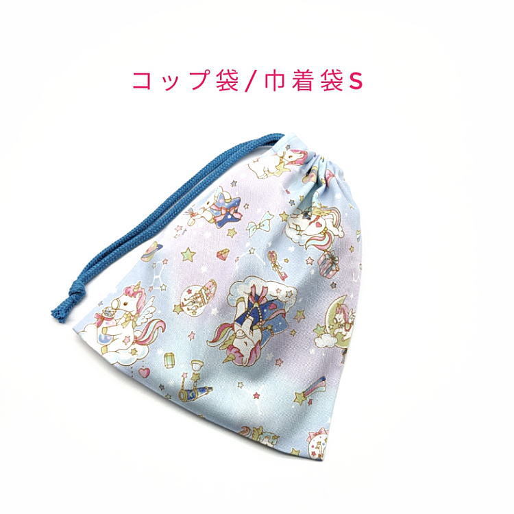 コップ袋・巾着袋S【星空ユニコーン柄 ブルー】マチ無し 日本製 ランチ袋 ナフキン入れ ポーチ 給食袋 収納袋 女の子 ペガサス 星座 リボン