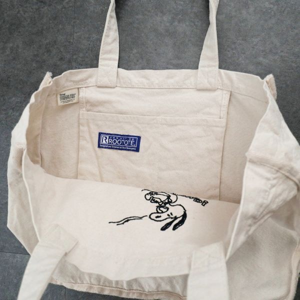 しっかりしたコットンキャンバス生地に、スヌーピーの刺繍が施された大容量のトートバッグです。