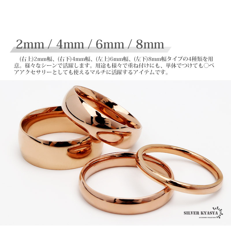 ・2mm幅、4mm幅、6mm幅、8mm幅タイプの4タイプ。様々なシーンで使え用途も様々。単体でつけても、重ね付けにも使え、ペアアクセサリーとしても使えるマルチに活躍するアイテムです。