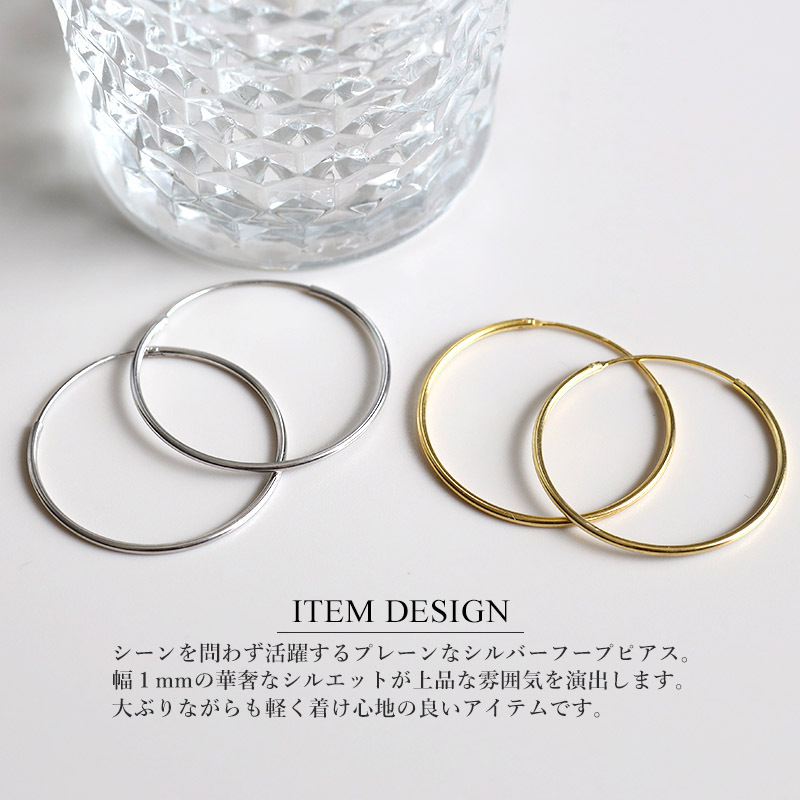シーンを問わず活躍するプレーンなシルバーフープピアス。幅1mmの華奢なシルエットが上品な雰囲気を演出します。軽いつけ心地で普段使いにぴったりなアイテムです。