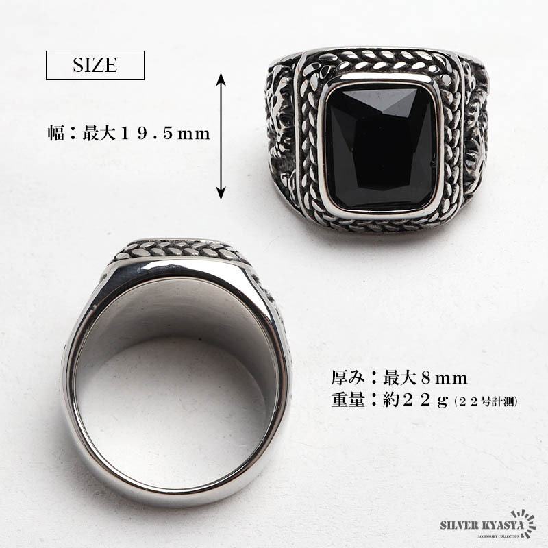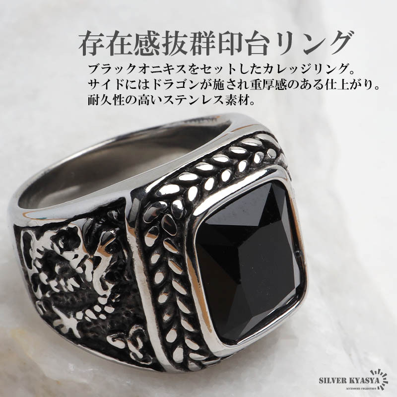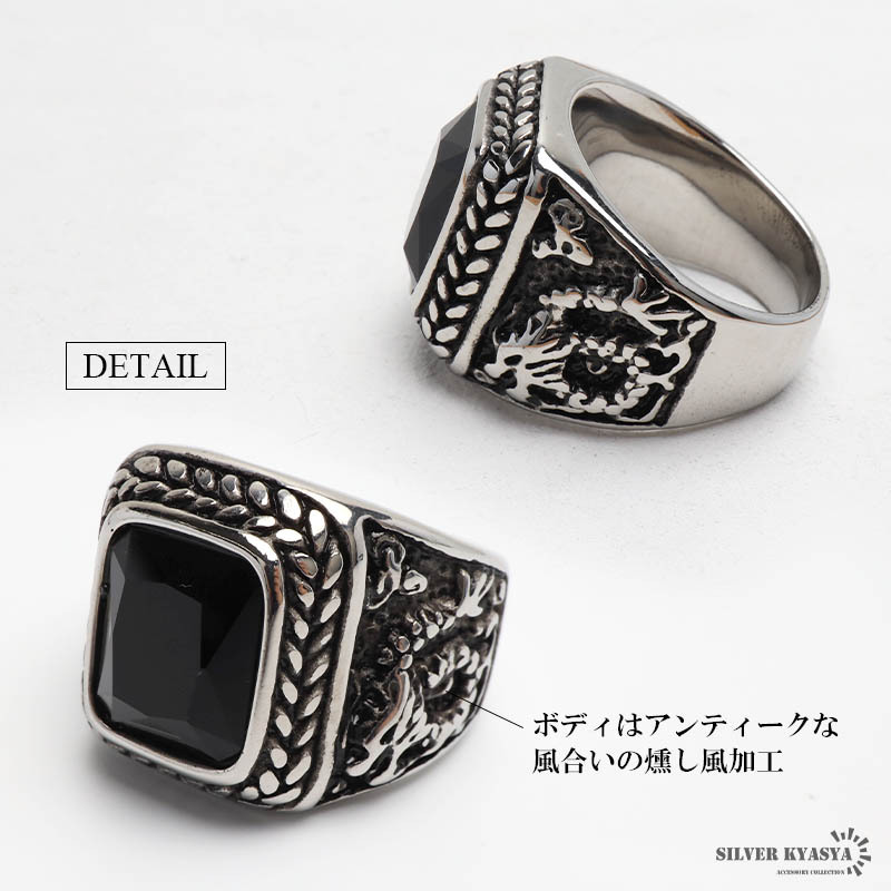 | 商品概要 | ■存在感抜群印台リング ブラックオニキスをセットしたカレッジリング。サイドにはドラゴンが施され重厚感のある仕上がり。耐久性の高いステンレス素材。 ■ステンレス素材を使用 金属部分は頑丈なことで知られるステンレス素材を採用。耐久性はもちろん耐水性も高く水場での着用も可能。金属アレルギーも出にくいとされている金属です。 |
