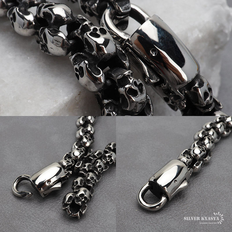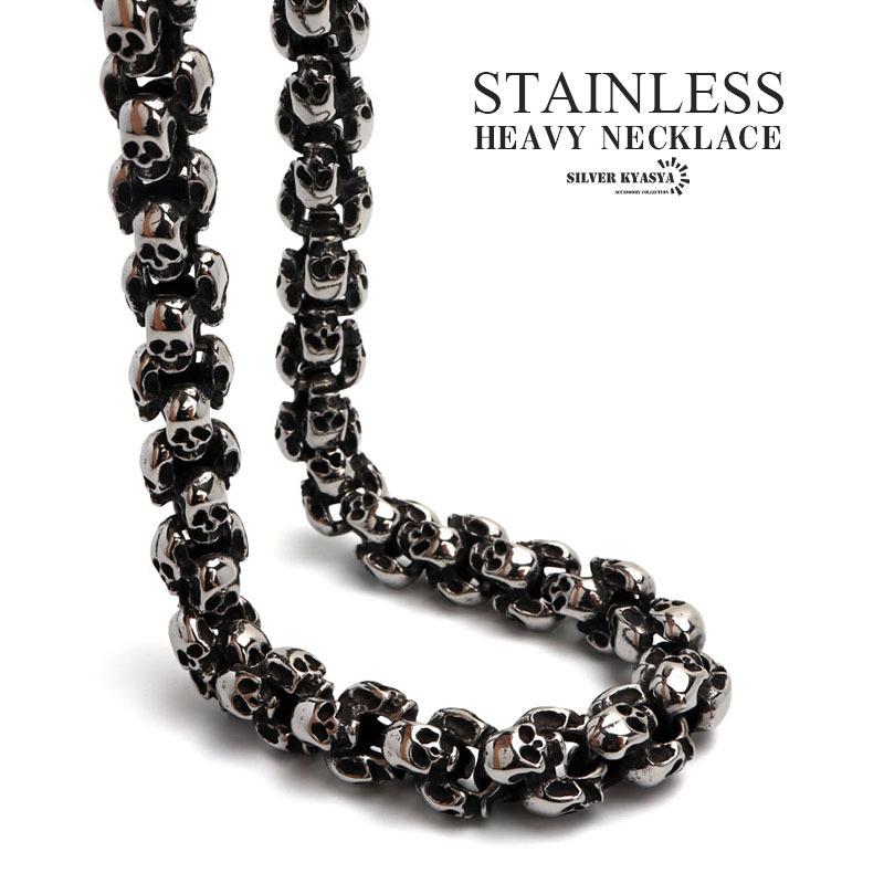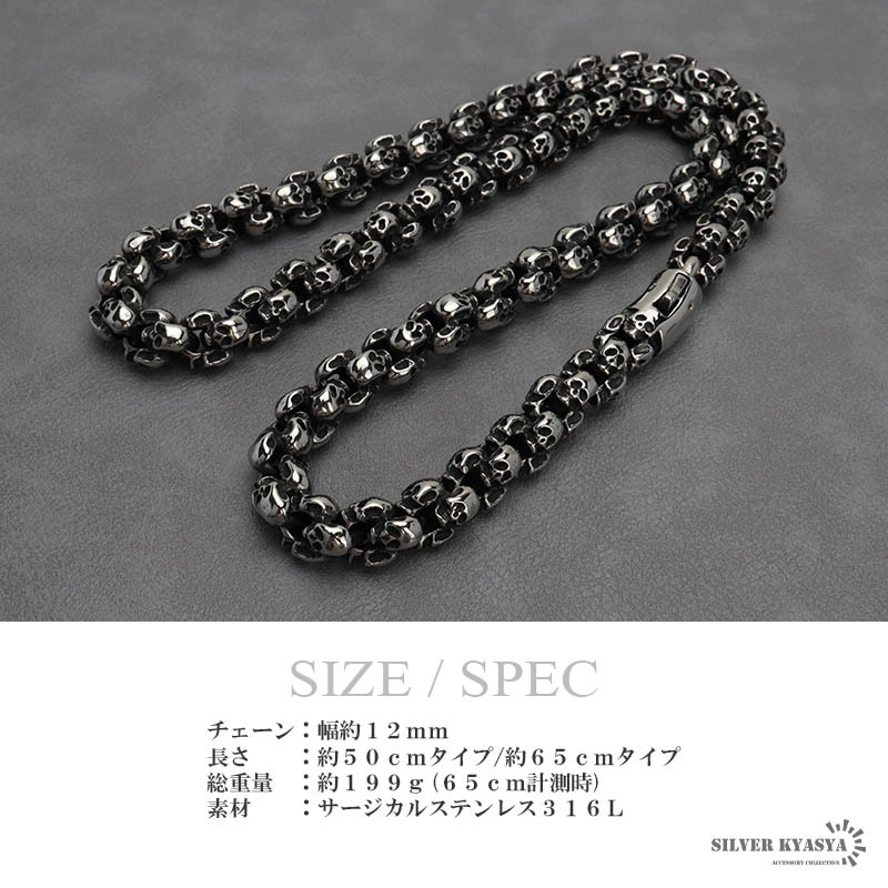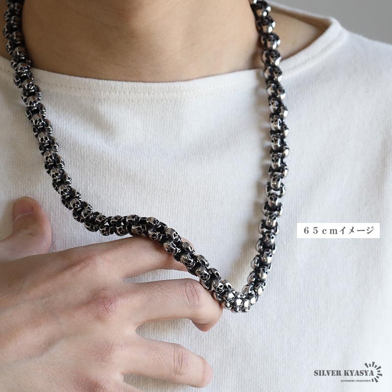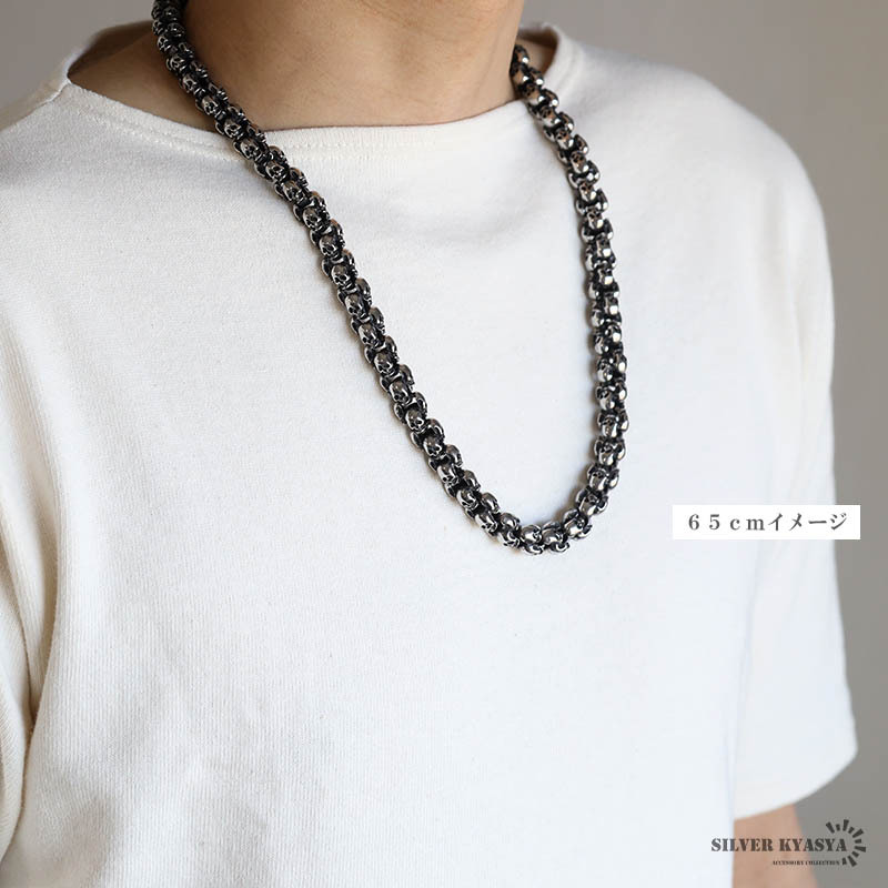 メタリックなシルバーとスカルチェーンがマッチしたネックレス。重厚感のあるスカルチェーンが首元にインパクトを与えてくれます。