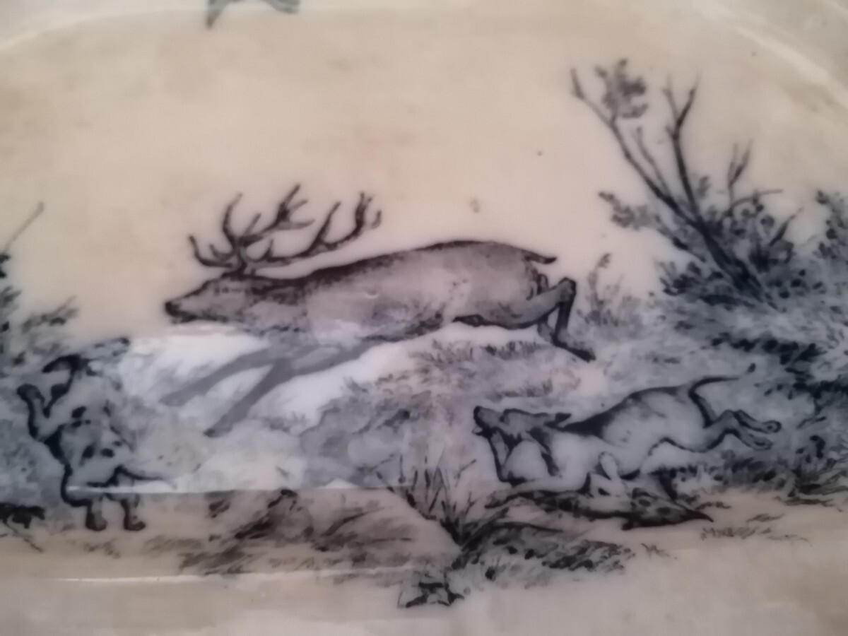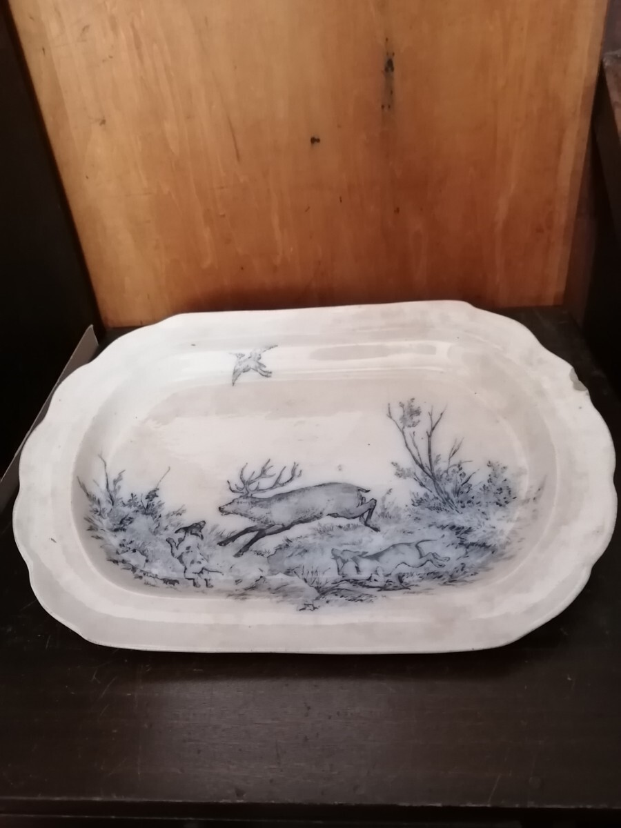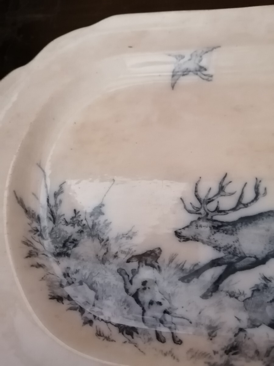 19世紀ビクトリア朝の染付のミート皿です。イギリス貴族の鹿狩の様子が描かれています。裏にメーカーの名前[CHEMISTY BARDMORE BENTON ]の刻印があります。角にホツレがあります。