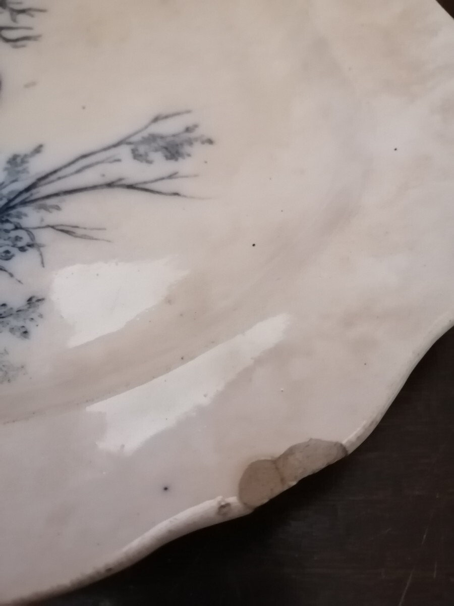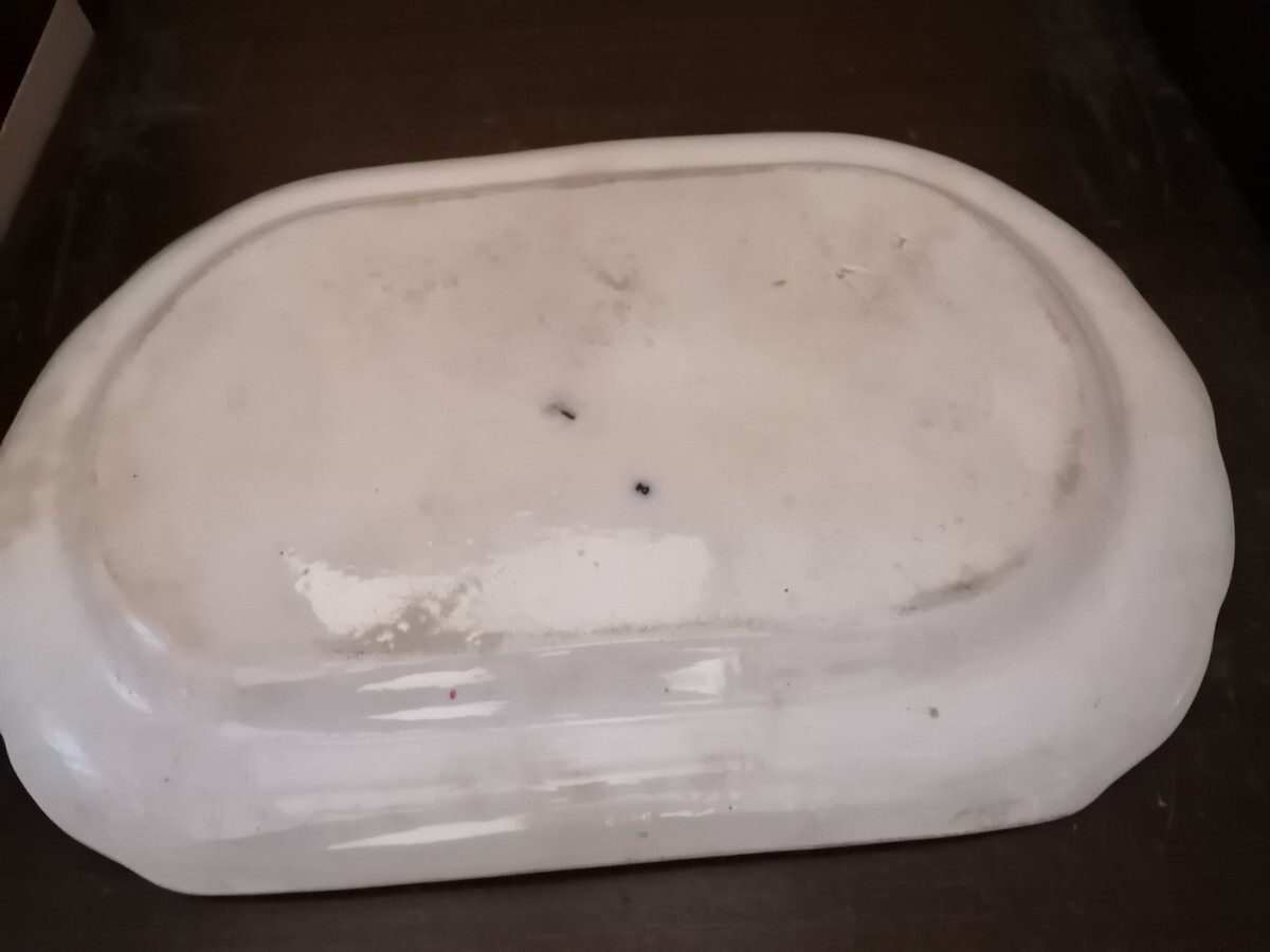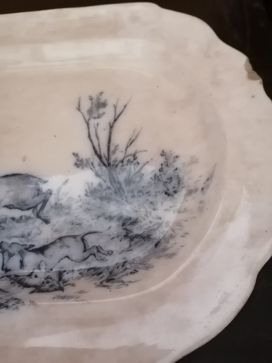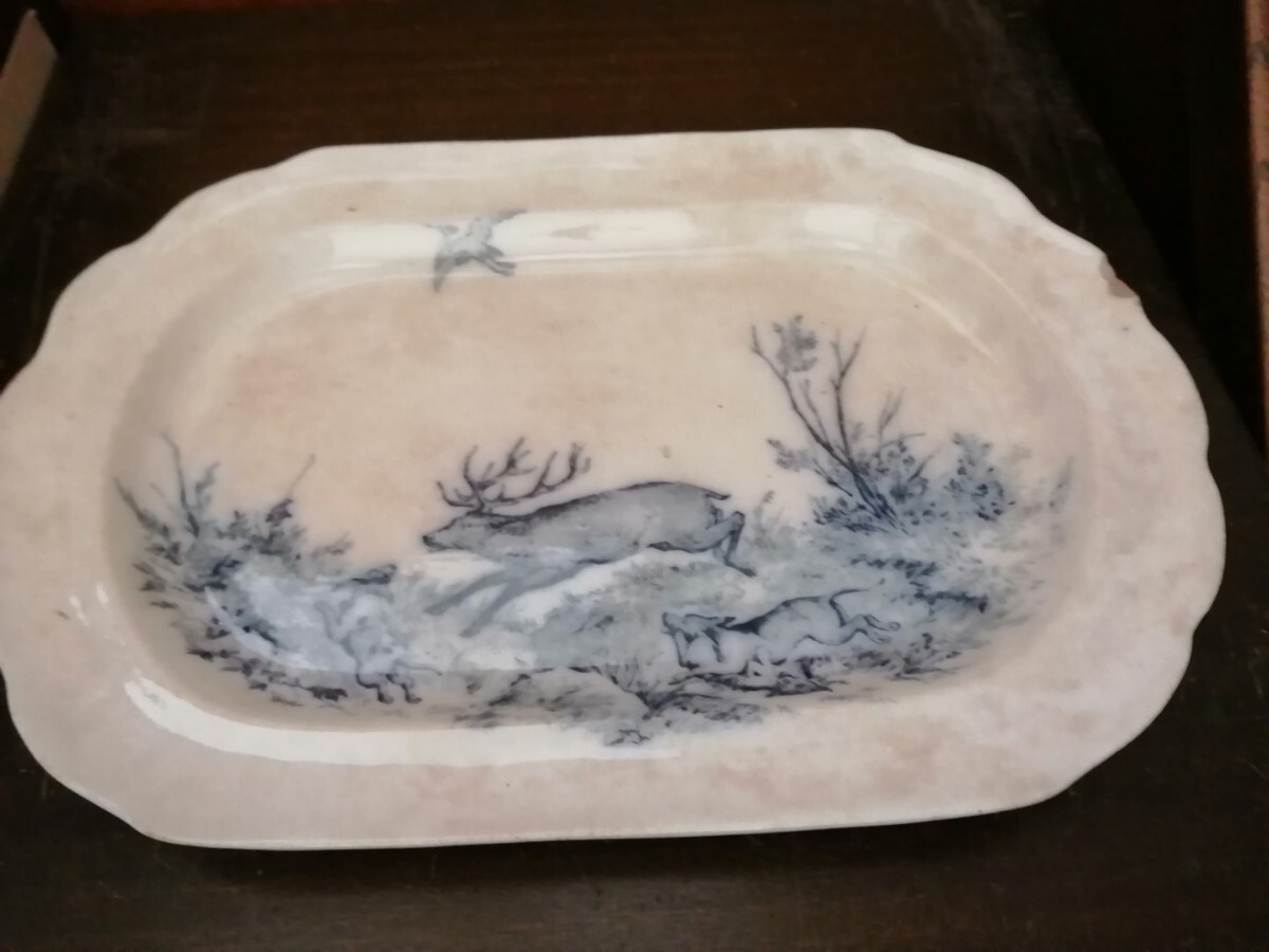 19世紀ビクトリア朝の染付のミート皿です。イギリス貴族の鹿狩の様子が描かれています。裏にメーカーの名前[CHEMISTY BARDMORE BENTON ]の刻印があります。角にホツレがあります。