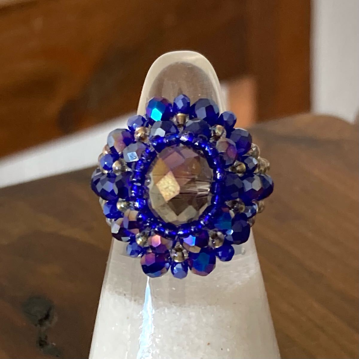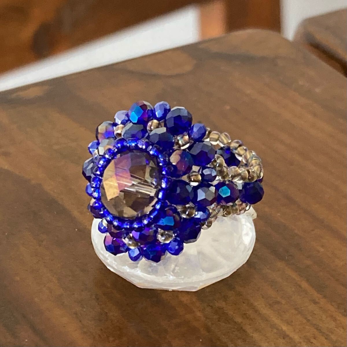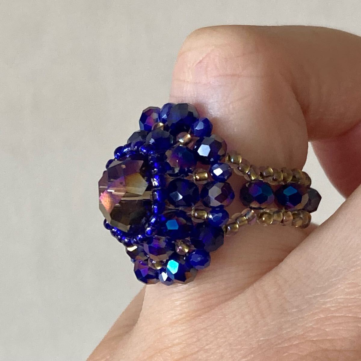 10mmのグレージュのボタンカットビーズ、4mmと2mmのネイビーのボタンカットビーズ、ブルー、クリアゴールド系の丸小ビーズで作ったリングです。