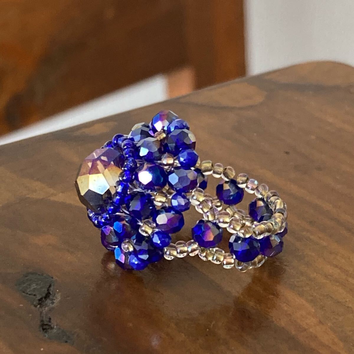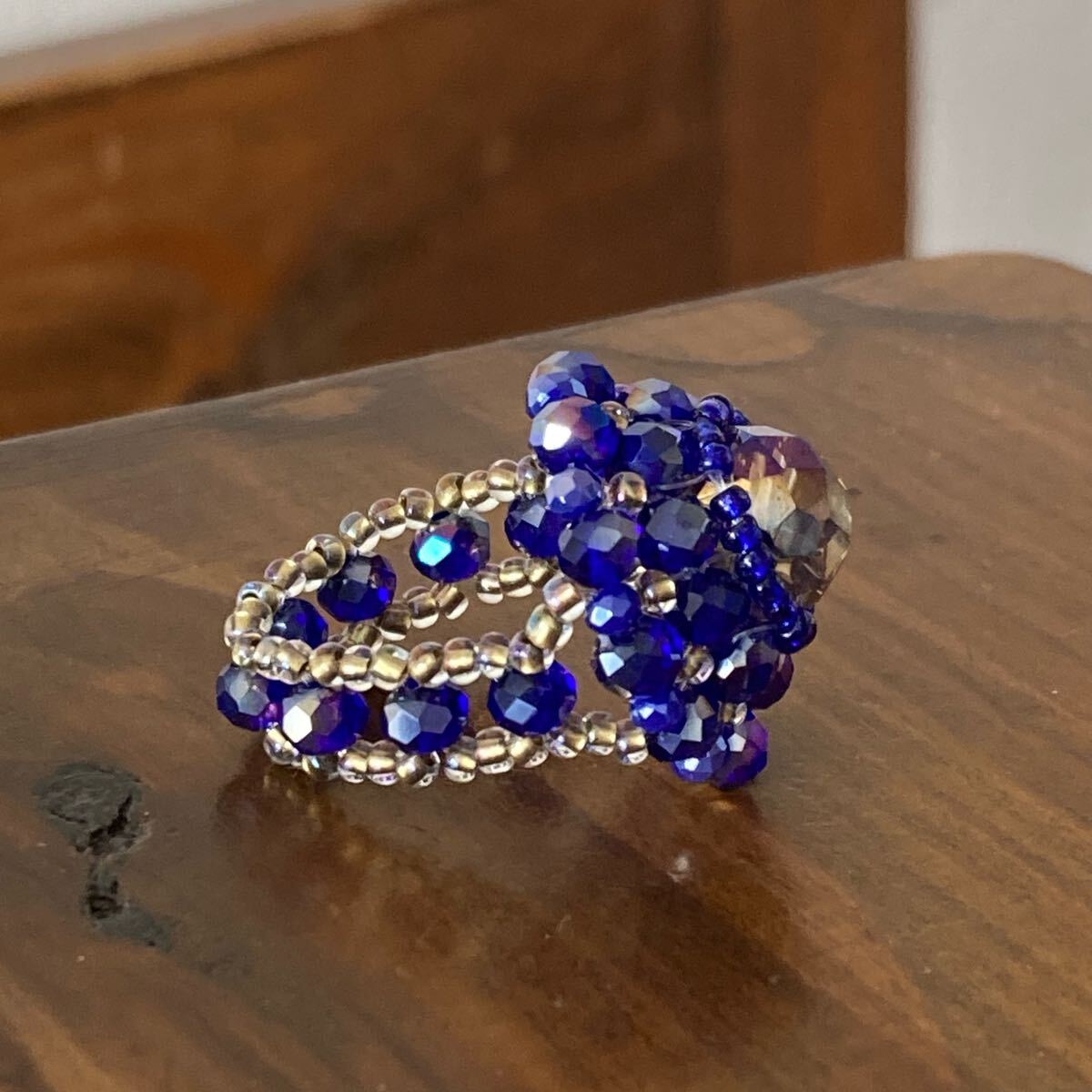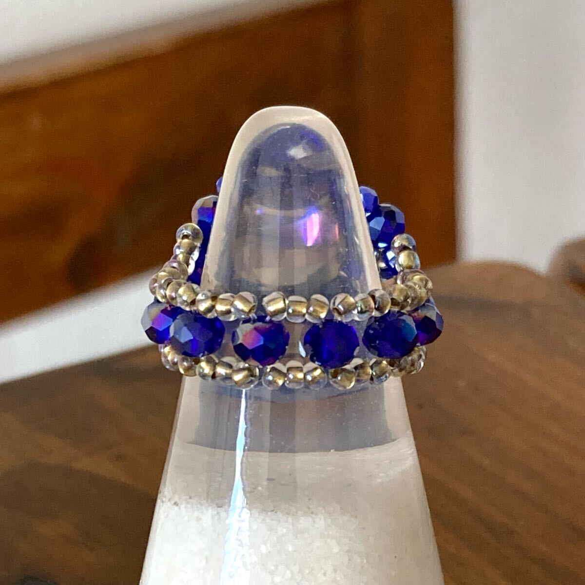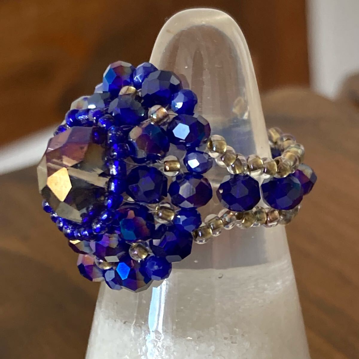 10mmのグレージュのボタンカットビーズ、4mmと2mmのネイビーのボタンカットビーズ、ブルー、クリアゴールド系の丸小ビーズで作ったリングです。