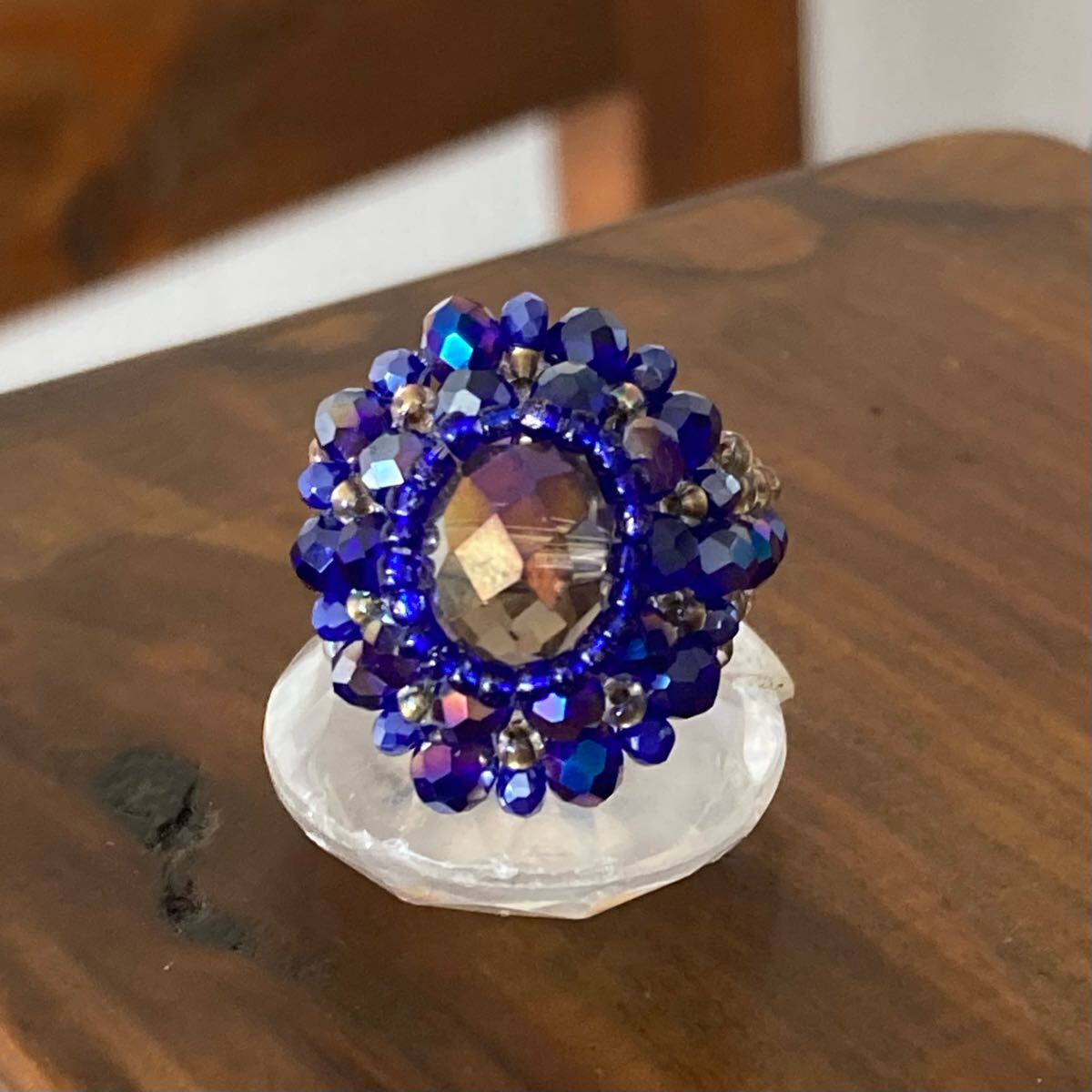 大きいボタンカットビーズの周りを細かく3重に編んだ可愛いデザインのキラキラリングです♪