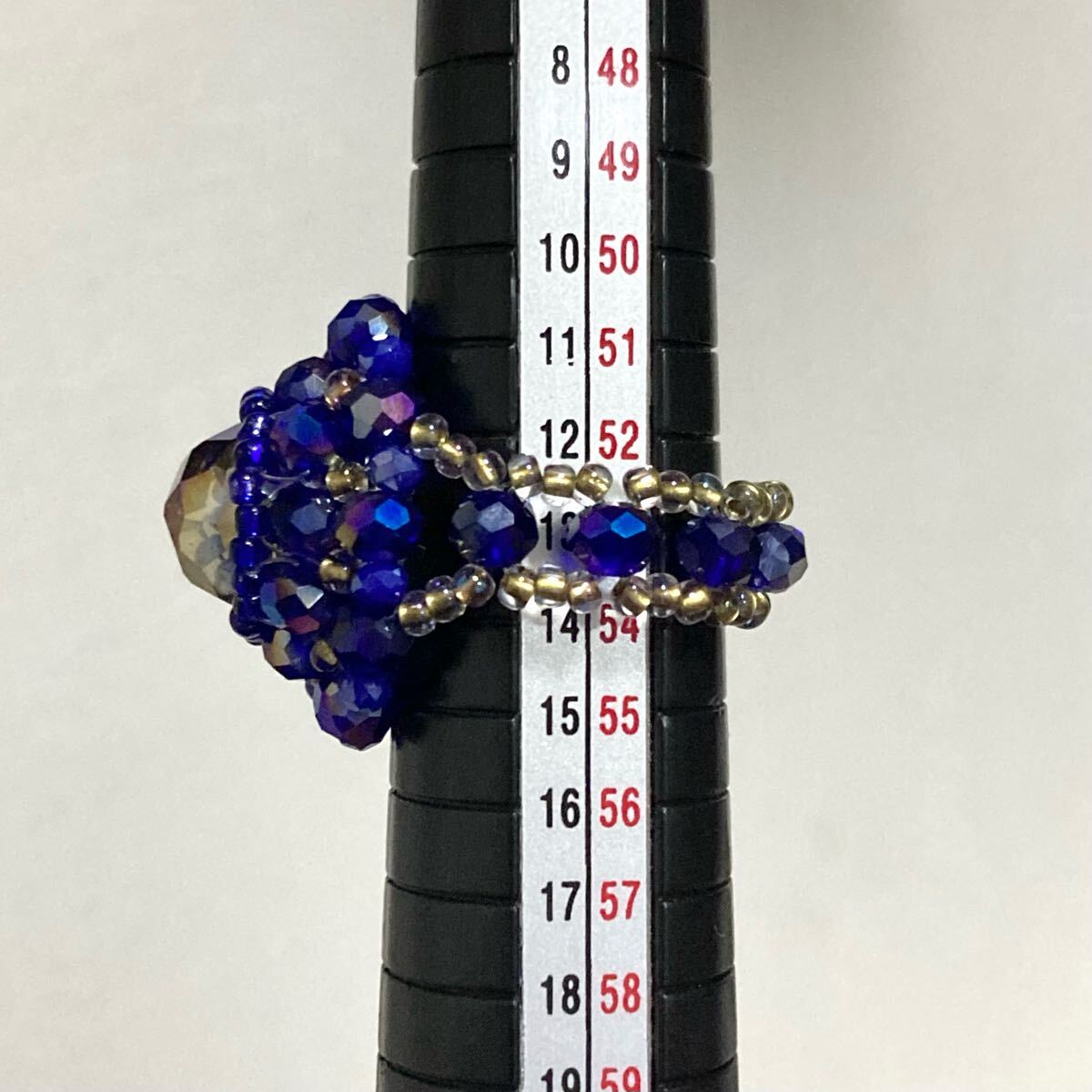 サイズは指周り約5.3cmです。(テグスなので前後します。)