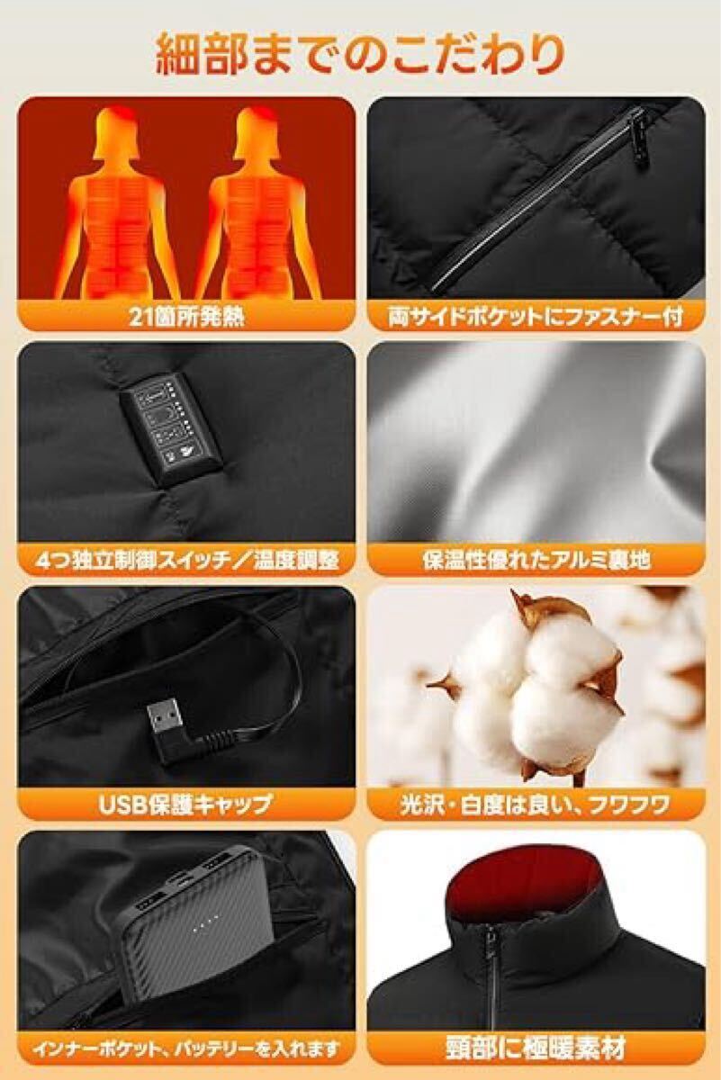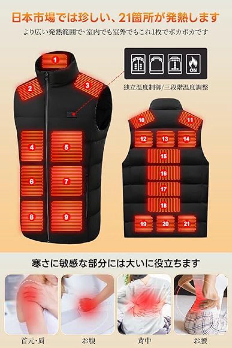 【21箇所発熱】21箇所に発熱体を搭載した、圧倒的な暖かさを提供する電熱ベストです。ヒーターベストは襟元、背中、腰や腹部など体の熱を感じられる場所に対して、21ヶ所から熱のアプローチが加えられますので、寒い季節でも快適にご使用いただく加熱ベストです。