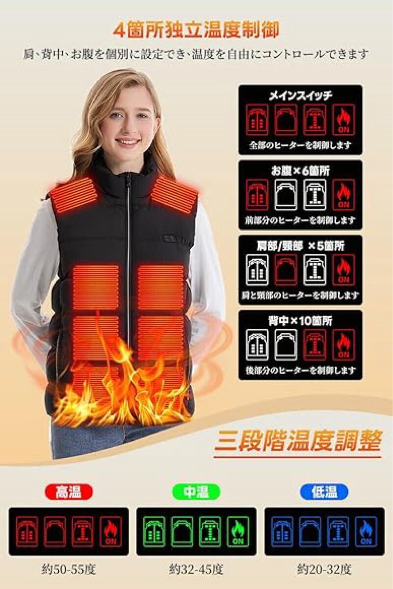 【4つ独立制御ボタン・3段階温度調節】電熱ベストは背中・腰・肩・全身の4箇所には独立して制御ボタンが付けられており、それぞれ必要に応じて電源のオンオフが可能。発熱箇所の組み合わせも可能です。自分自身で細かく温度調整できるので、「暑すぎる」と感じることはない電熱ウェアです。また、電熱ジャケッは温度調節も低・中・高と3段階をボタン1つで切り替えることができます。