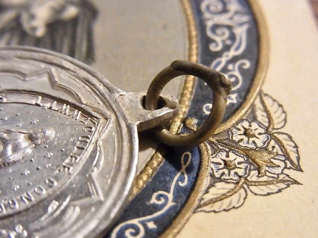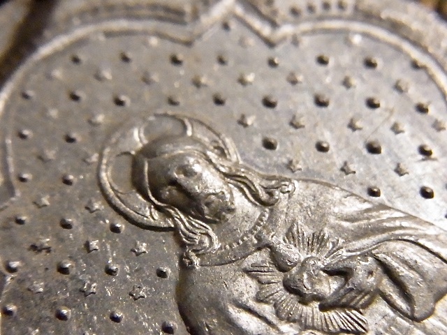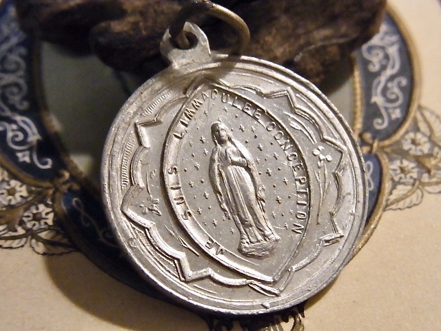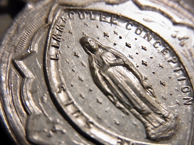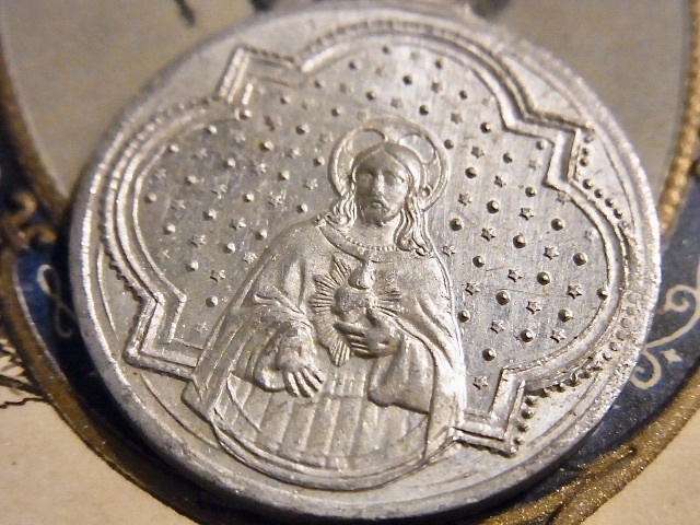 片面は聖母マリア、もう片面はイエズスの聖心を象った少し大きめのメダイです。