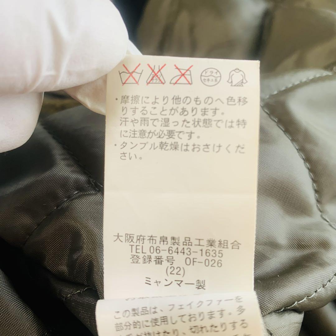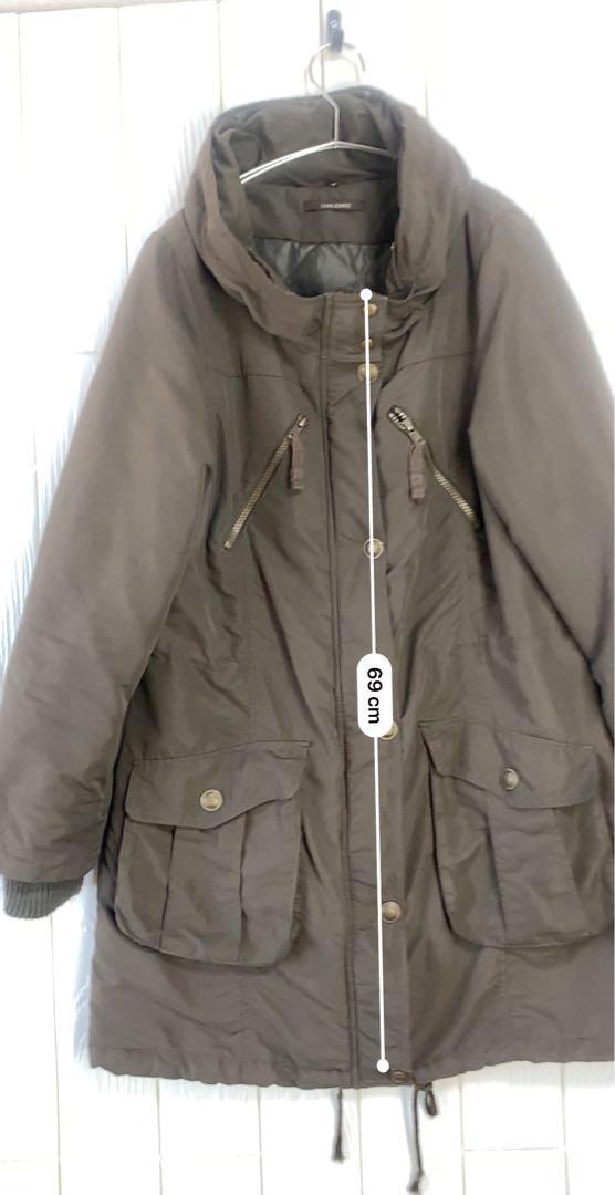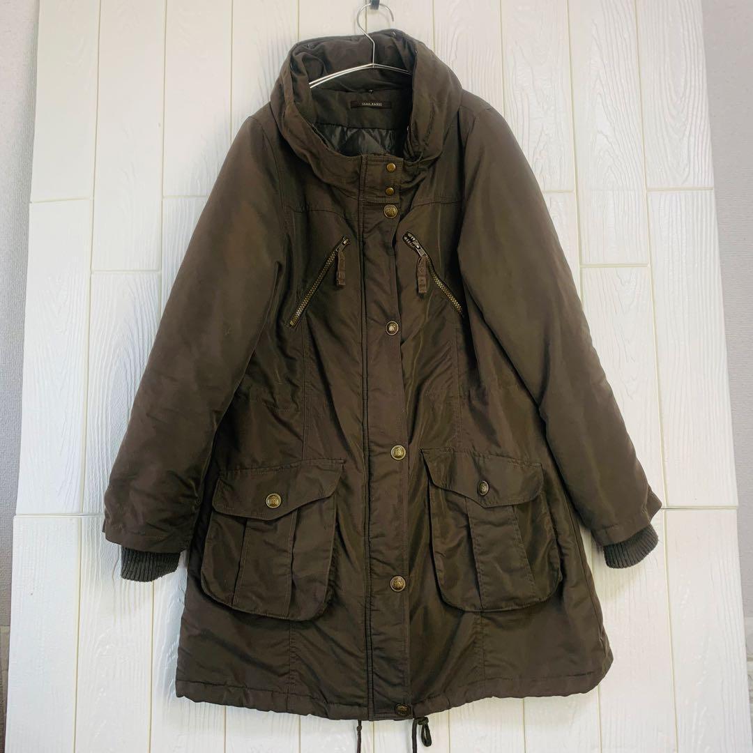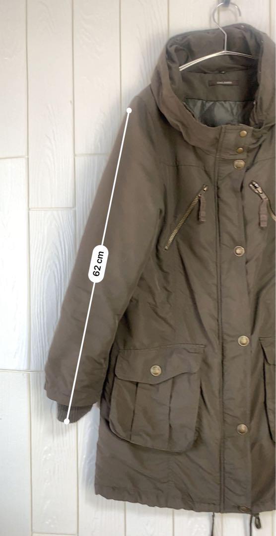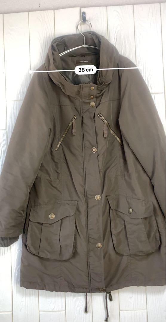 オリーブ色のモッズコート、取り外し可能なフード付き、4つのポケット。