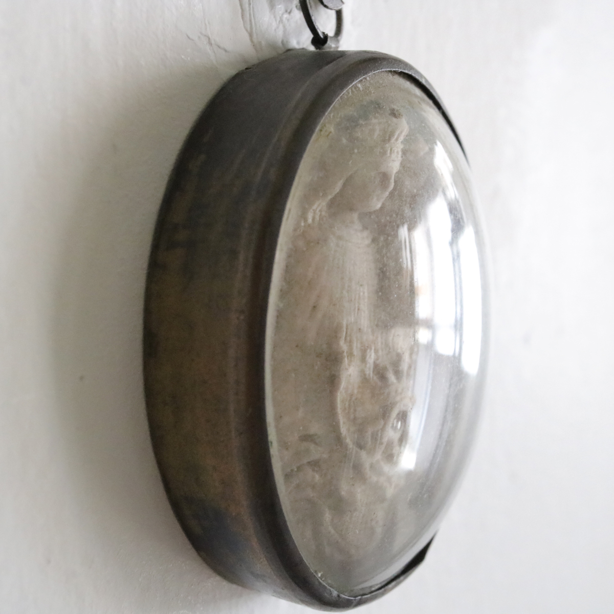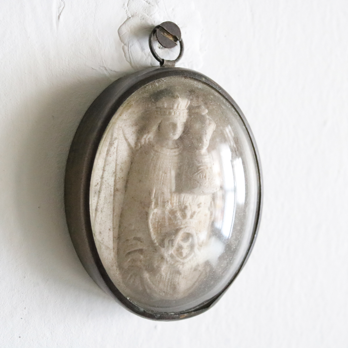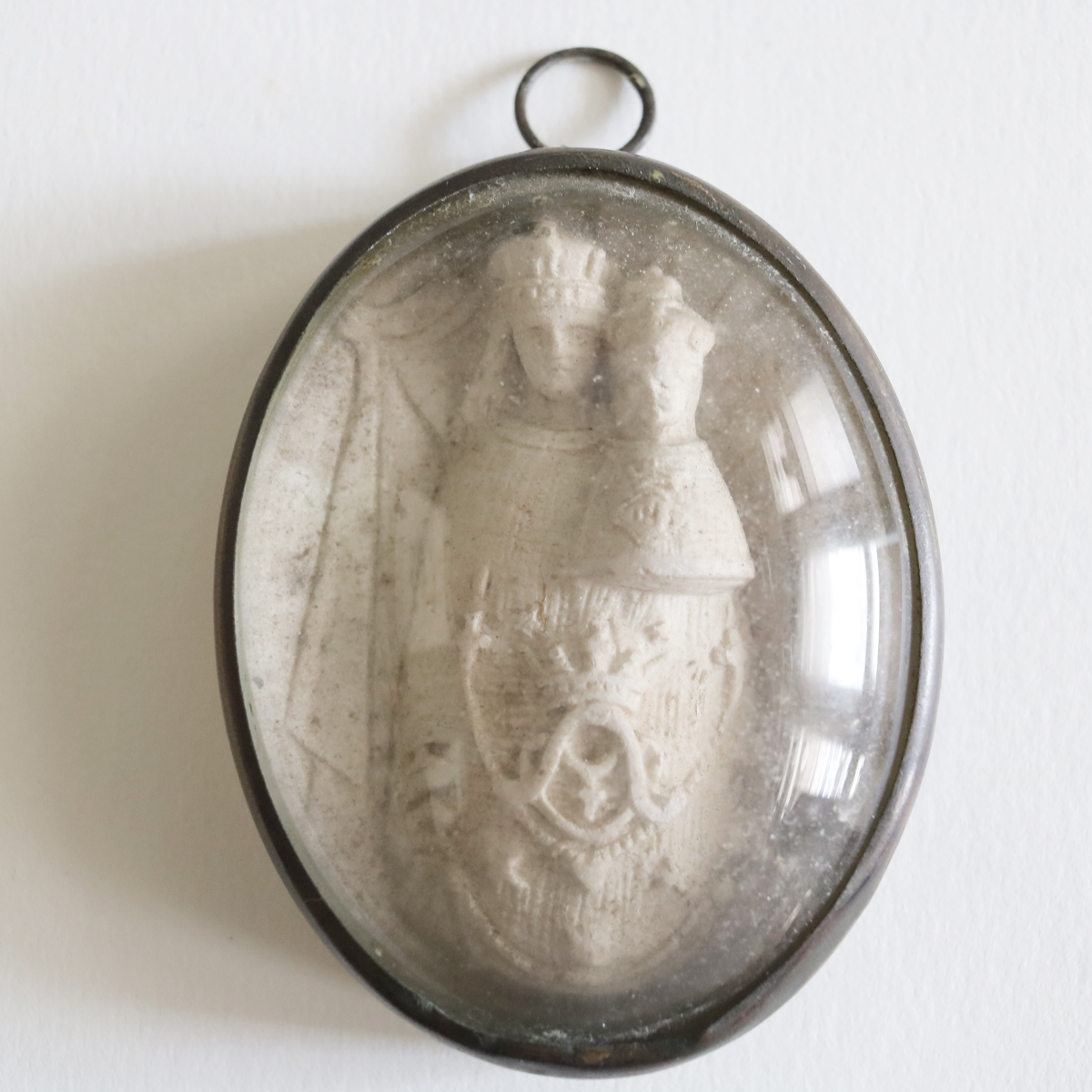 19世紀 1800年代 ガラスドーム 聖母マリア 教会 キリスト マリア フランスアンティーク 聖品 クロス 十字架 メダイ メシャム オーバル 彫刻