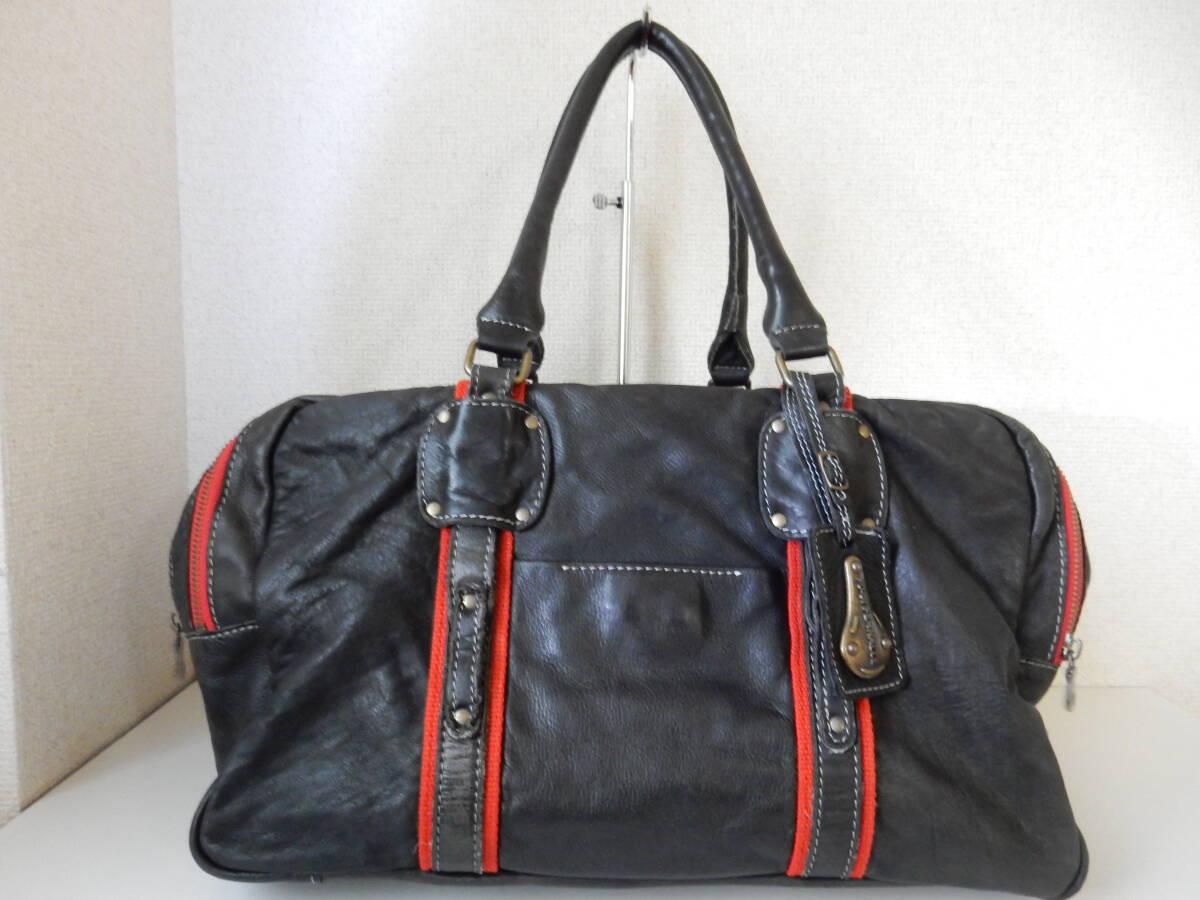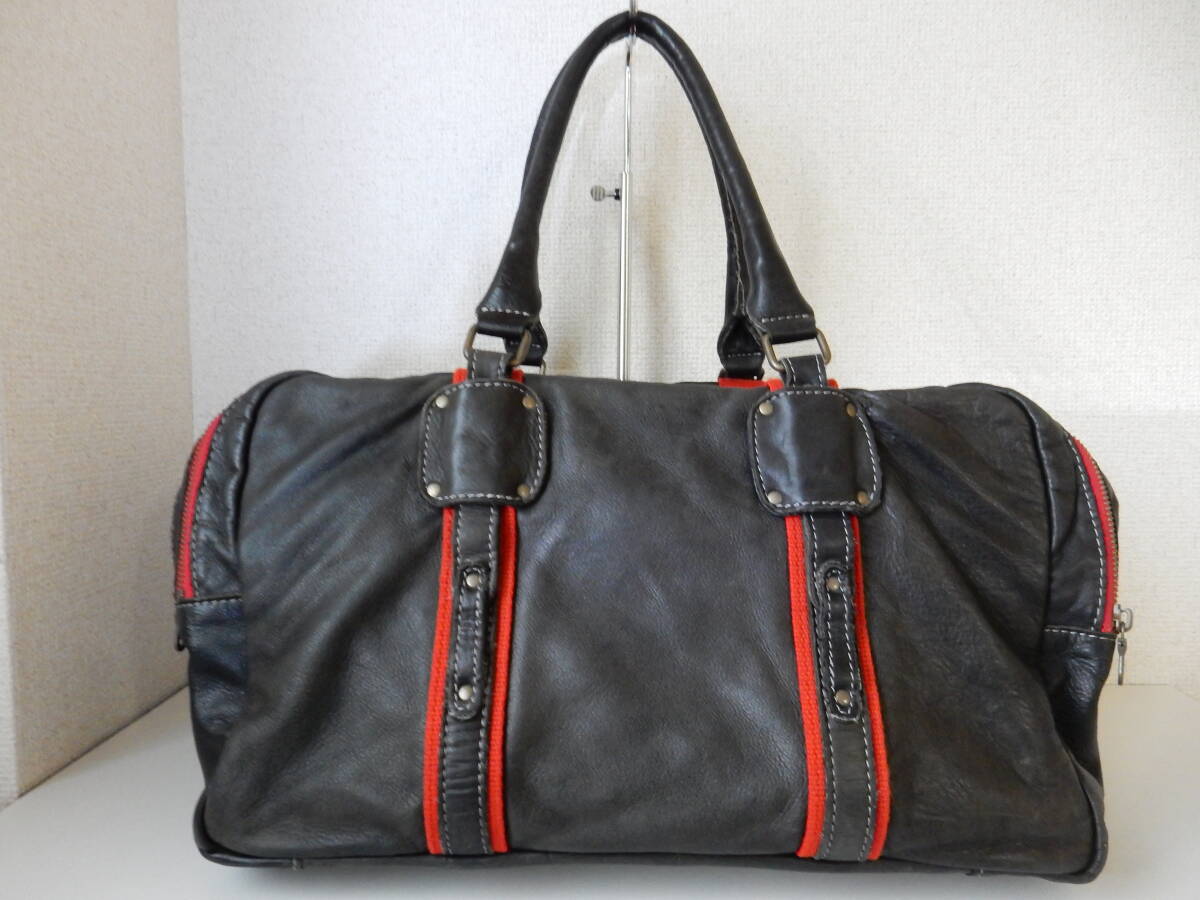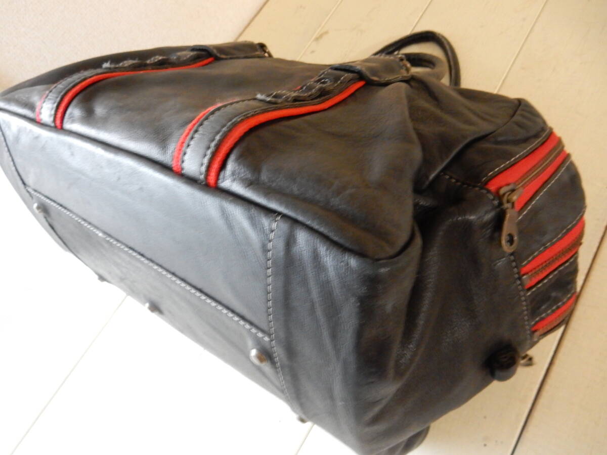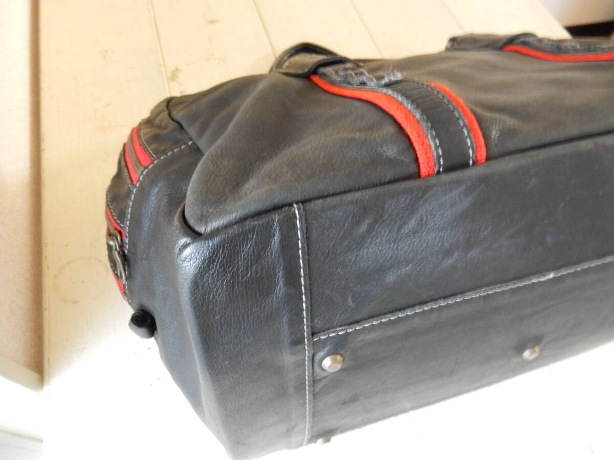 赤のトリミングとロゴチャームがアクセントとなった本革トートバッグ。