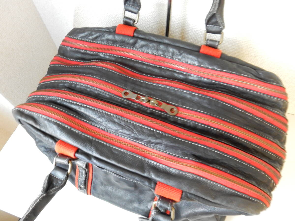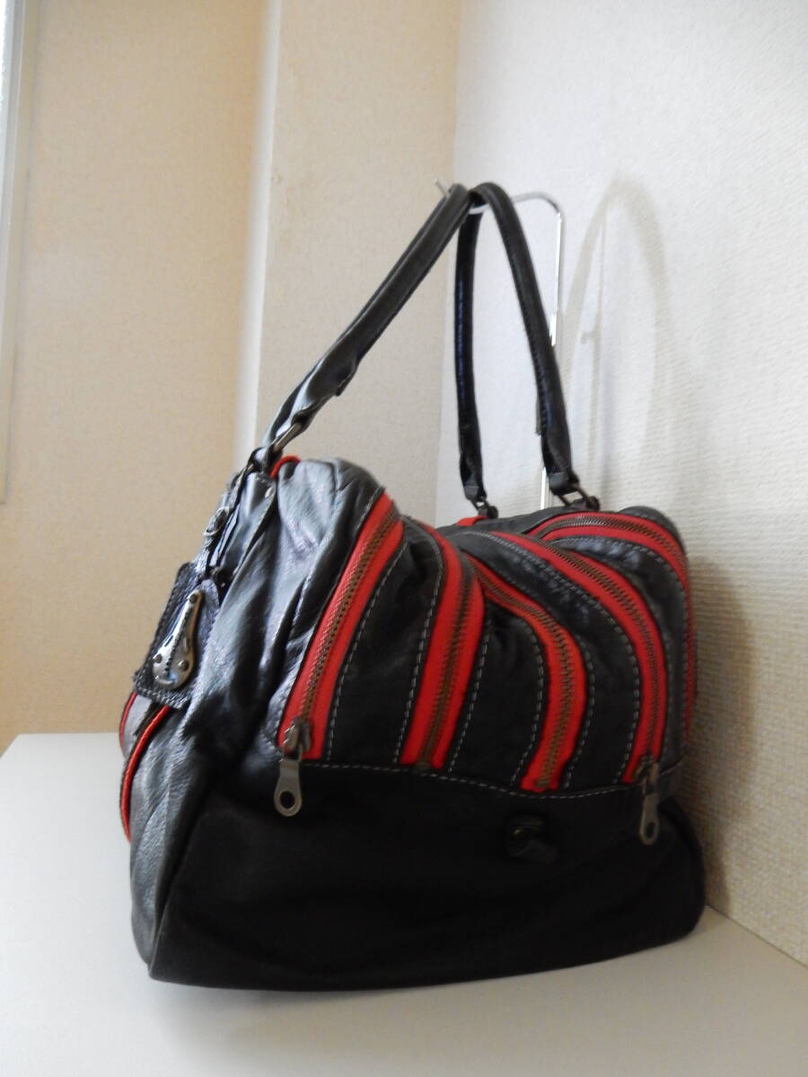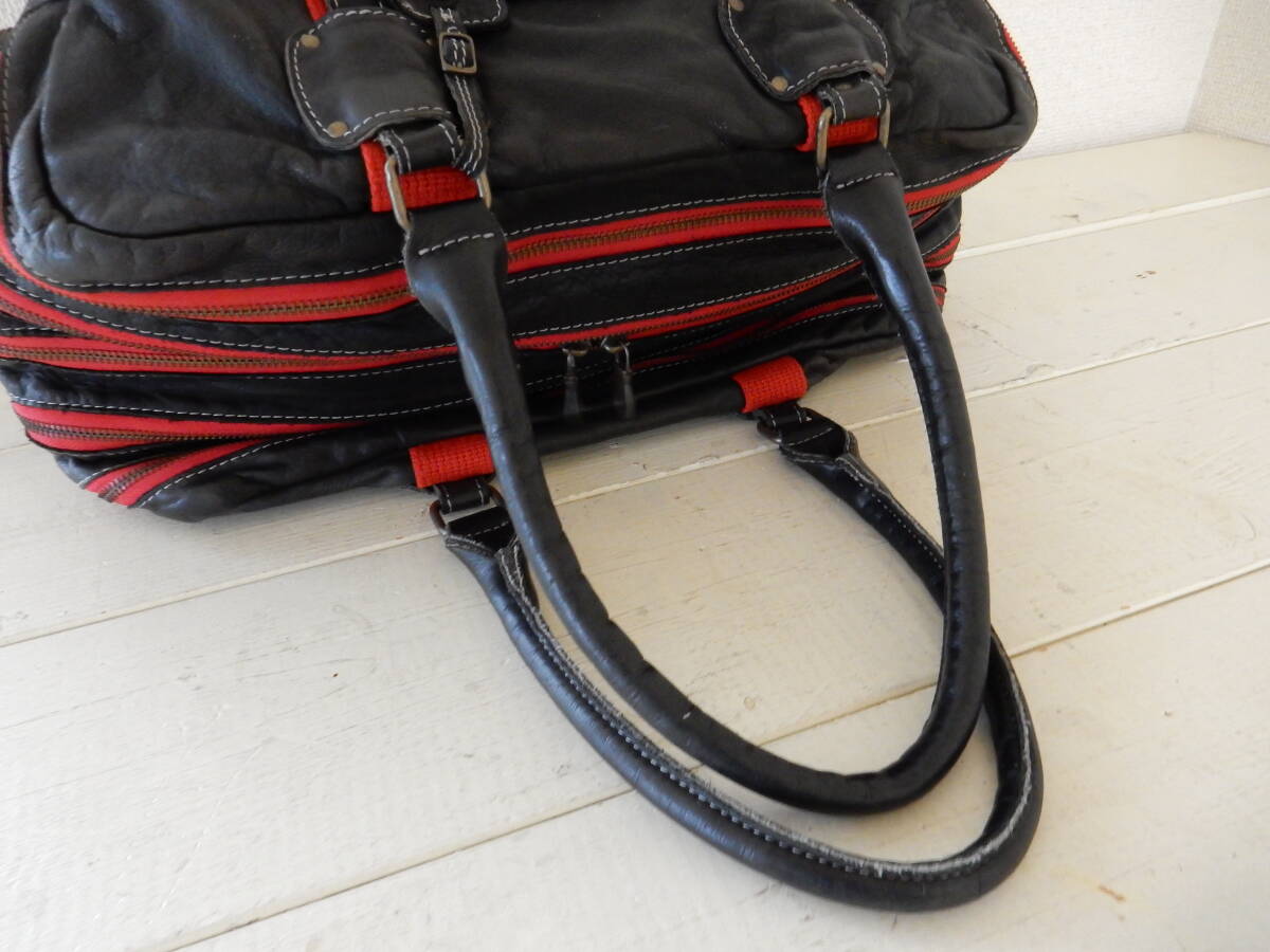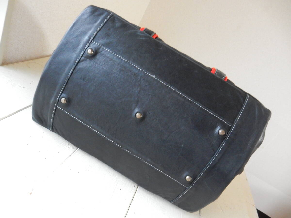 赤のトリミングとロゴチャームがアクセントとなった本革トートバッグ。
