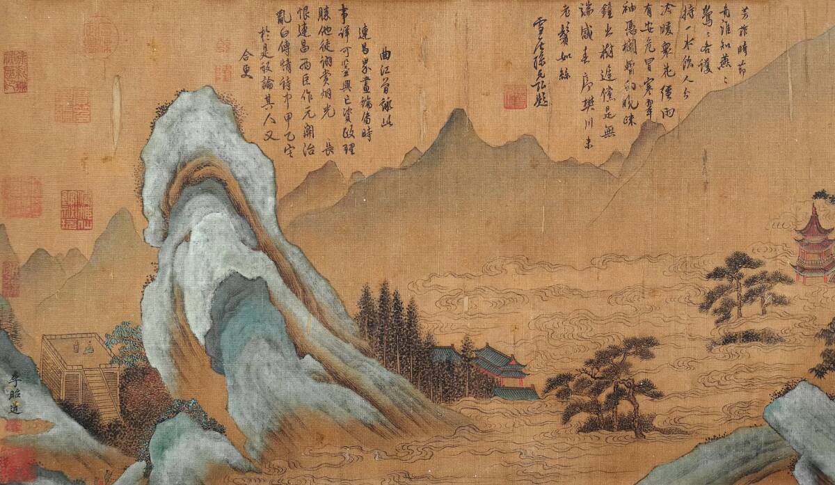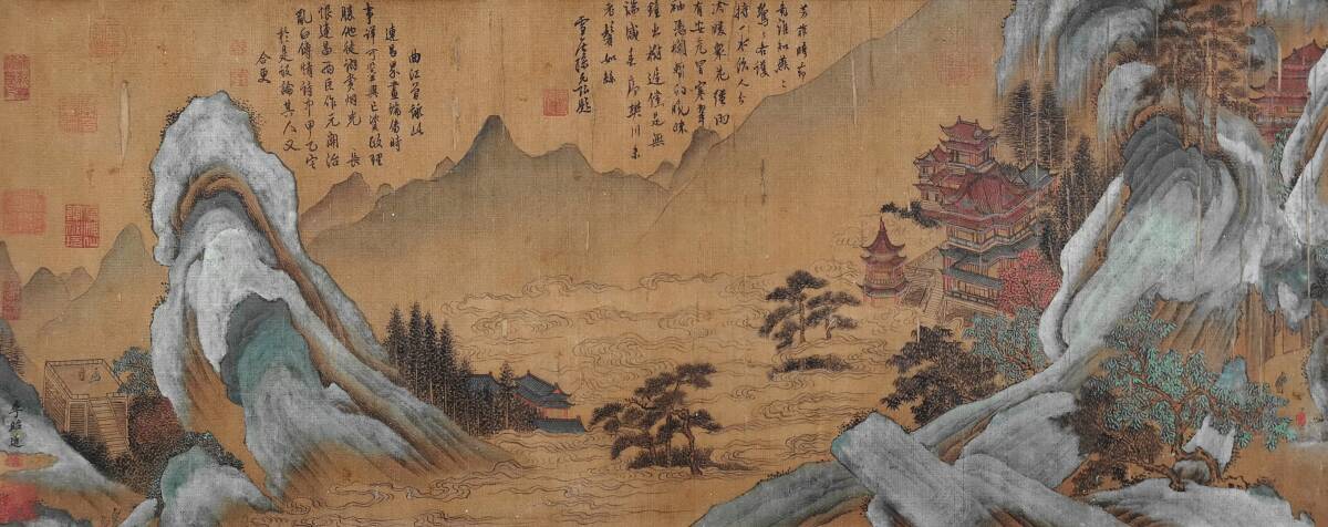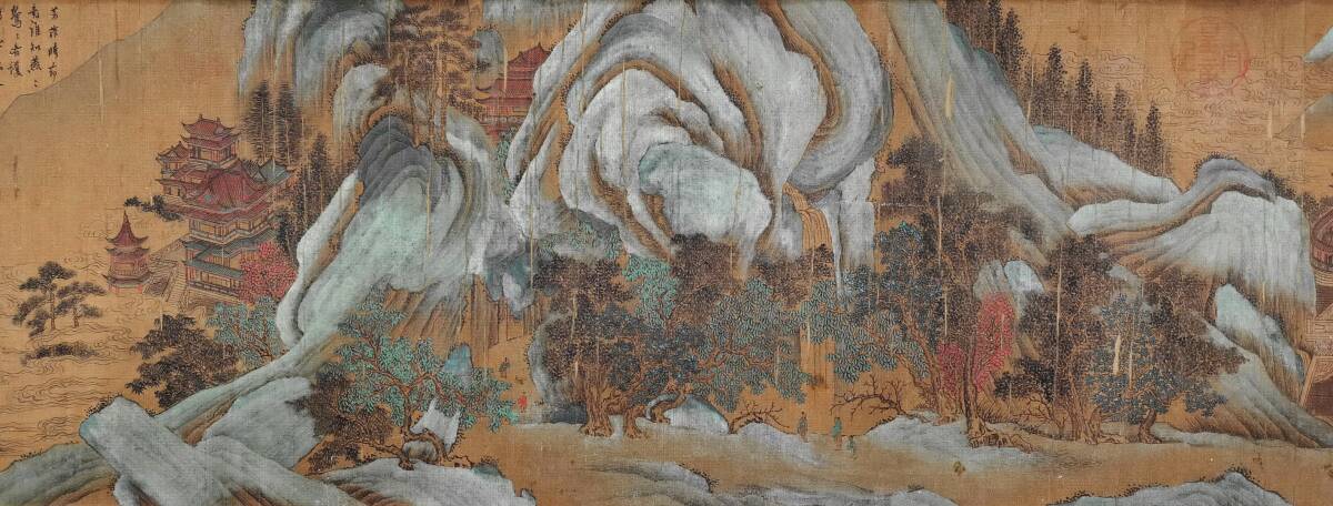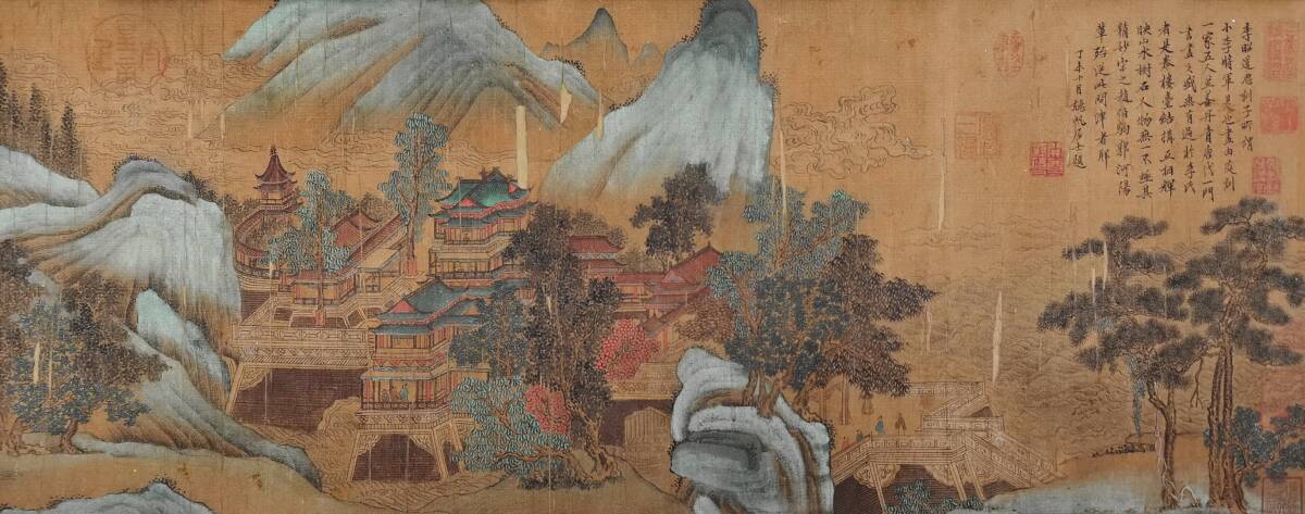 作家:李昭道 時期:唐時代 寸法:画心部204 × 35 cm全長約8メートルです 形製:絹本設色長巻 状態説明:精装は古く表装されていて、品相がよい,保存は完全である。具体的な保存状態は写真を見てください。 掲載写真をご確認ください。 ※モニターの具合により実際の色と異なる場合がございます。ご了承ください。 | |||