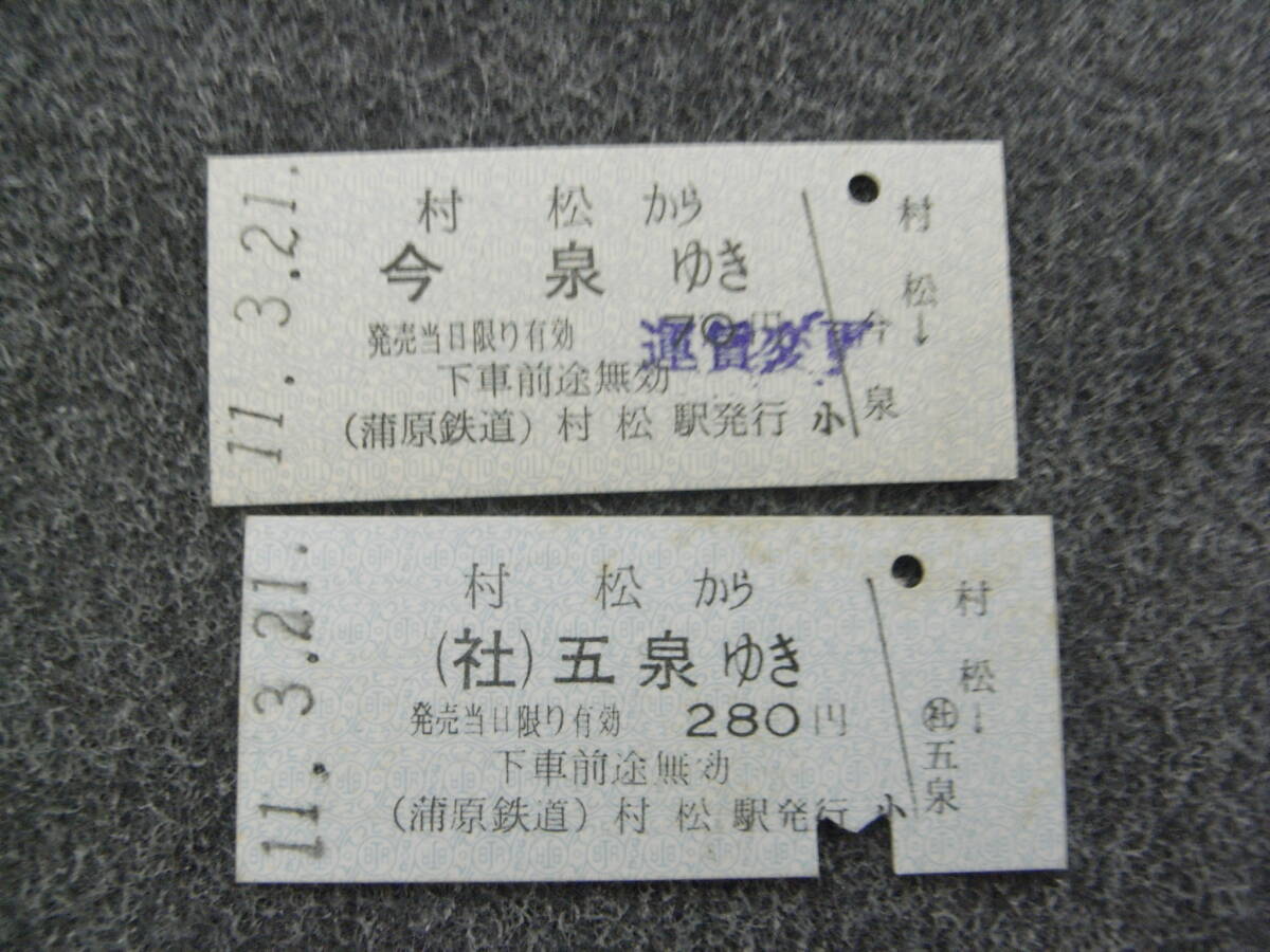 2枚/蒲原鉄道 村松駅発行硬券乗車 村松から今泉・村松から(社)五泉ゆき 平成11年3月21日 村松駅発行 2枚