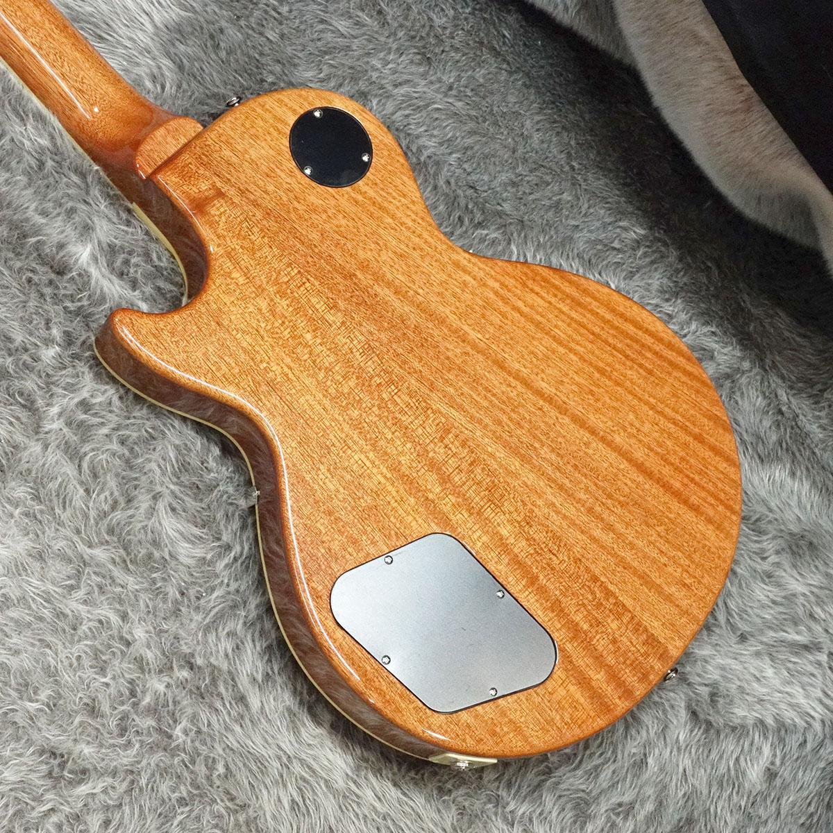 美しい杢目のフレイムメイプルトップ、マホガニーバック、1Pマホガニーネック、ローズウッド指板のウッドマテリアル。