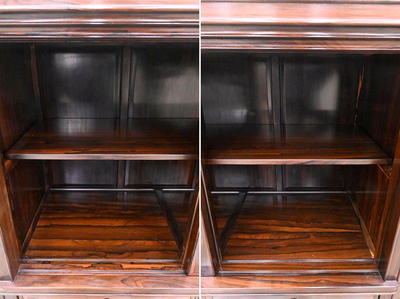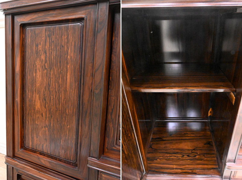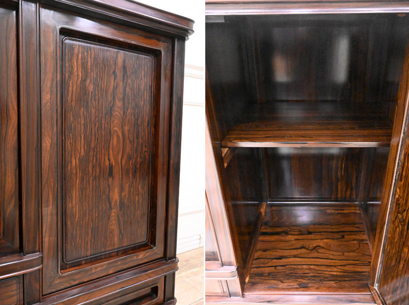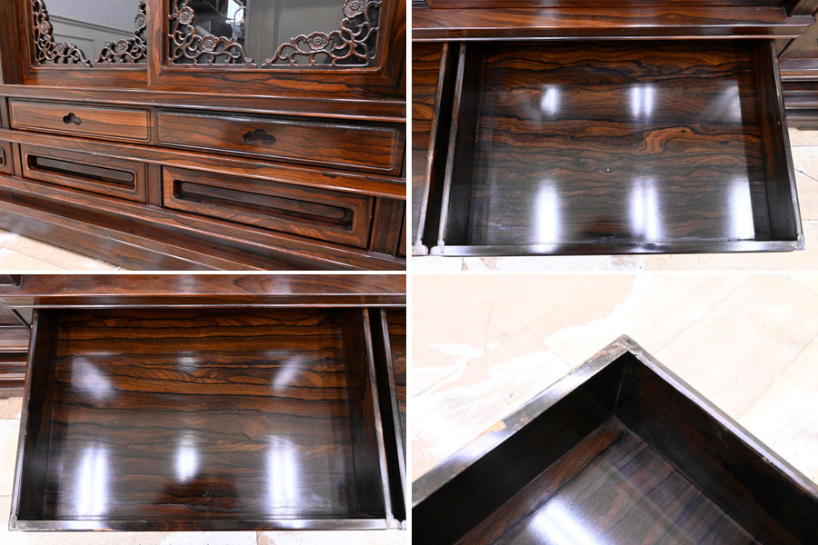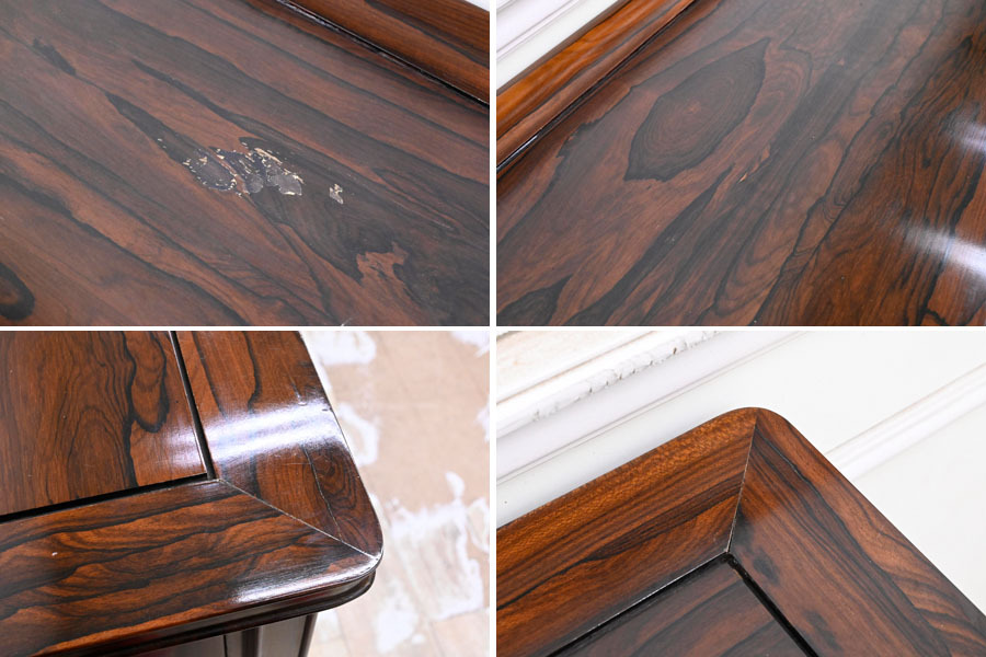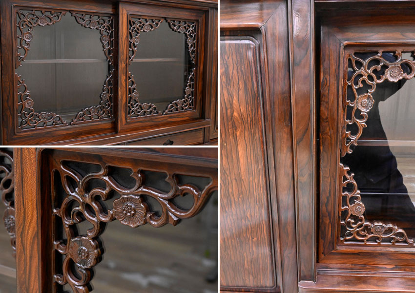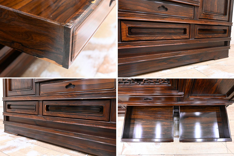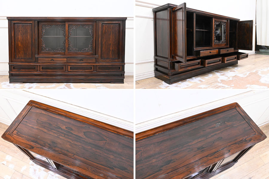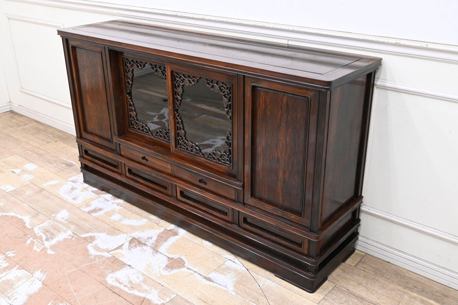 ----------------------------------------------------------------------------------------- ●送料や注意事項は必ずご確認下さい。落札後にトラブルになるケースが増えております。● ◆コンディションは写真・文章にて記載して有りますが、全てのキズの写真は掲載致しておりません。大きなダメージを除き見落とし、記載漏れが有る事はご了承下さい。 ◆当サイトにて出品する商品は多種多彩で、当方商品知識の無い物も多数ありますので落札後の質問やメンテナンス等にはお答えできません。 ◆入札された時点で、画像、文章をご理解していただいたものと判断させていただきます。不明な点は前もってQ&Aからお願い致します。入札後の質問やお電話等でのキャンセルは一切受け付け致しません。 ◆商品説明に「ノークレーム」と記載しているものに関しては、如何なる状況で届いても保証致しません。詳しくは注意事項の「商品到着後について」の最後に記載しておりますのでご確認下さい。 ---------------------------------------------------------------------------------------- 黒柿を使用した大変贅沢なサイドボード、中古品の出品です。 今では希少な黒柿無垢材を使用した逸品です。 独特の木目を持ち、圧倒的な存在感あるお品です。 幅158.5 奥41.5 高88.5cm 【コンディション】 中古品ですのでキズ、スレ、多少の薄汚れ、天板一部表面コーティング剥がれ、線キズ、角の接合部スキマ薄っすらとヒビ、中央ガラス戸の本体が緩んでいるのか?上部分スキマ、天板薄っすらとシートの跡等ありますが、状態はマズマズ良好です。 | ||