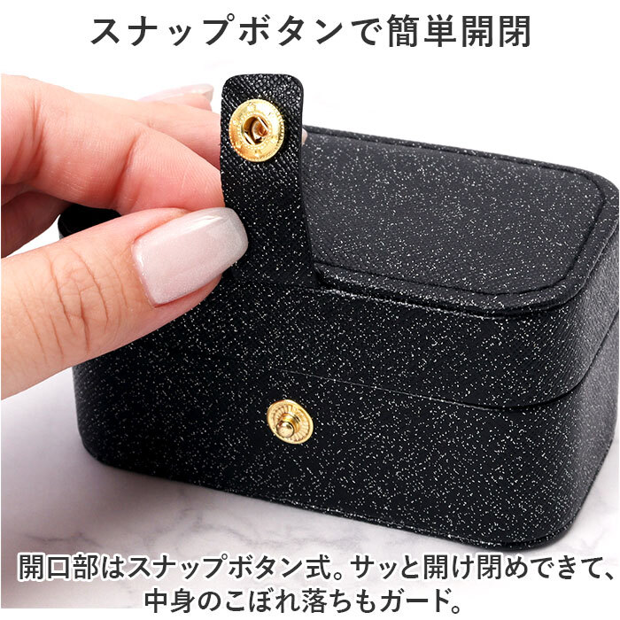 商品説明 | ・・持ち運びに便利!コンパクトなアクセサリーケースが新登場。 ・【シンプルで上品なデザイン】 ・柔らかく滑らかな手触りのPU素材を使い、落ち着きのある雰囲気に。年代問わず使いやすいのがポイント。 ・【スナップボタンで簡単開閉】 ・開口部はスナップボタン式。サッと開け閉めできて、中身のこぼれ落ちもガード。 ・【取り出しスムーズなボックス型】 ・中身がひと目で分かり、取り出しやすいボックスタイプ。 ・【お気に入りのジュエリーをすっきり】 ・内側には3つのリングスロット、4つのピアス穴、ブローチなどを入れるフリースペースを配置。ピアス穴下にはギャザーポケットも。 ・【大切なアイテムをしっかり保護】 ・柔らかな素材の内張り仕様。大切なアクセサリーを傷や衝撃からガード◎ ・【サッと持ち出せるサイズ感】 ・手のひらに収まるミニサイズ。旅行や出張、お仕事やお出かけの際にもバッグに忍ばせやすいのが嬉しい! ・【うれしい撥水性をプラス】 ・表面に汚れや水をはじく撥水加工済み。お手入れも拭き取るだけ。 ・【お気に入りのカラーをチョイス】 ・ベーシックカラーや可愛らしいカラーをラインナップ。キラッとラメ感もポイント。 |