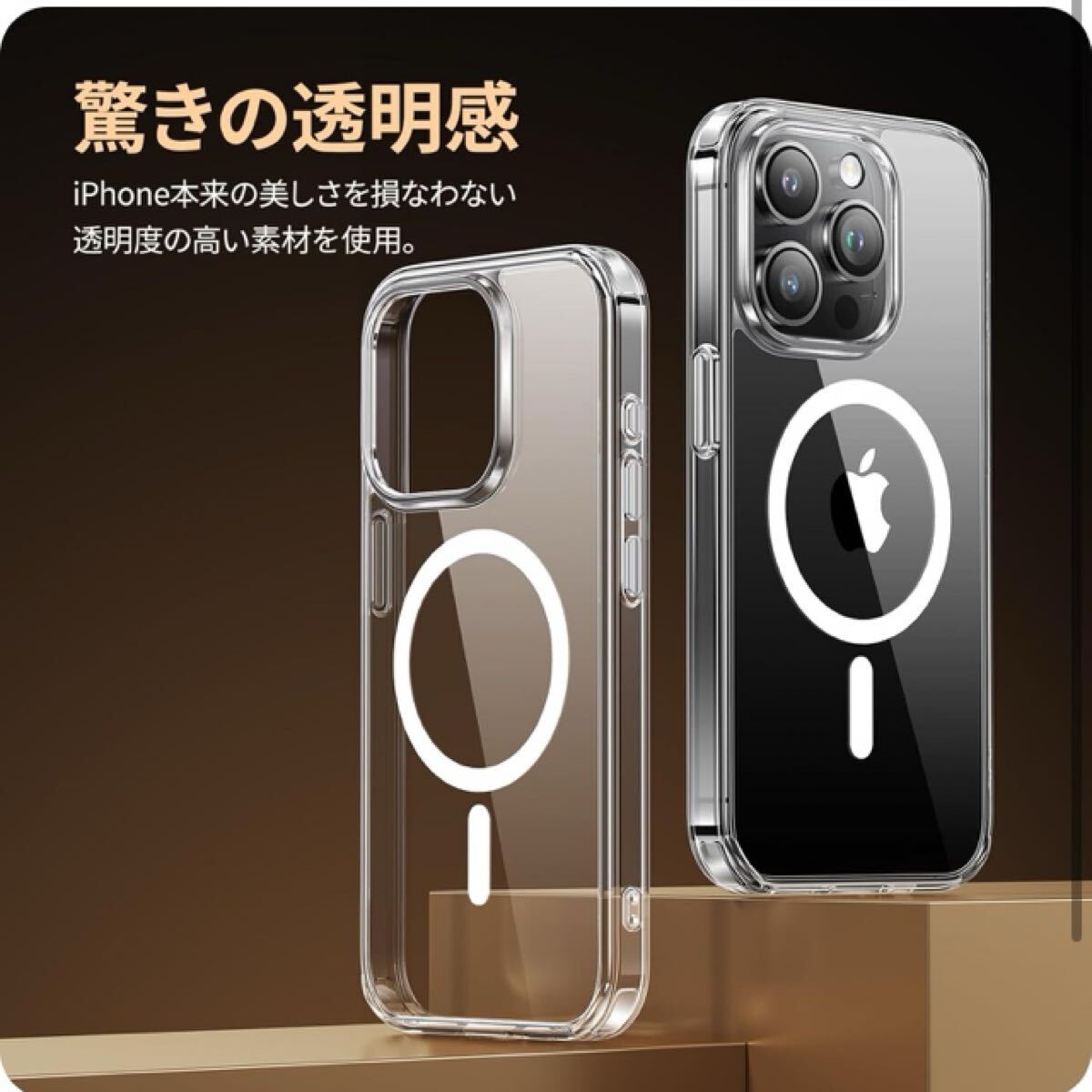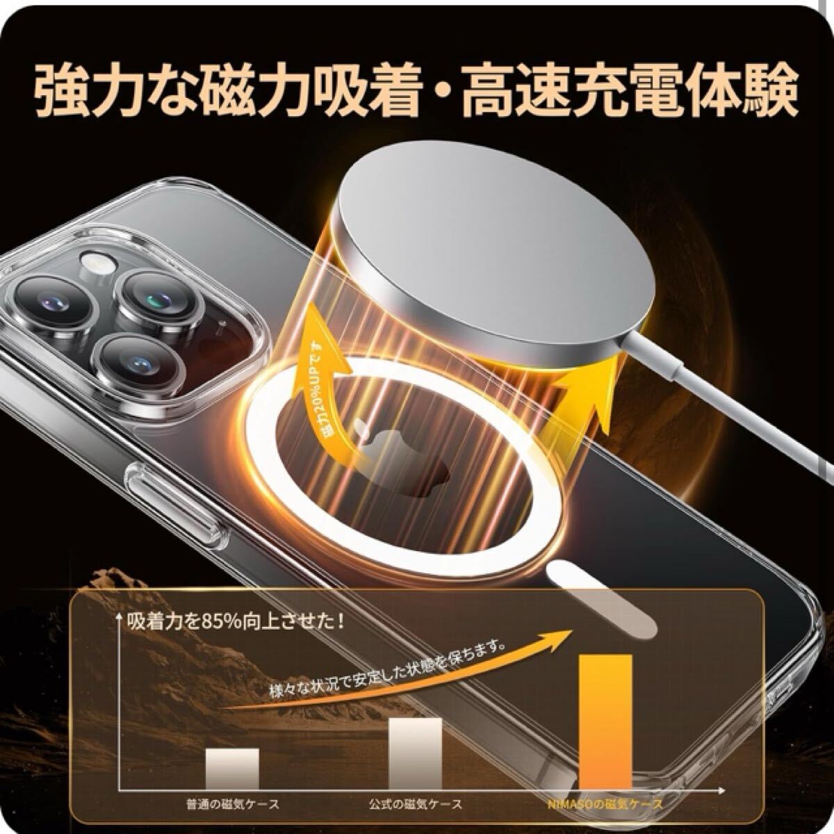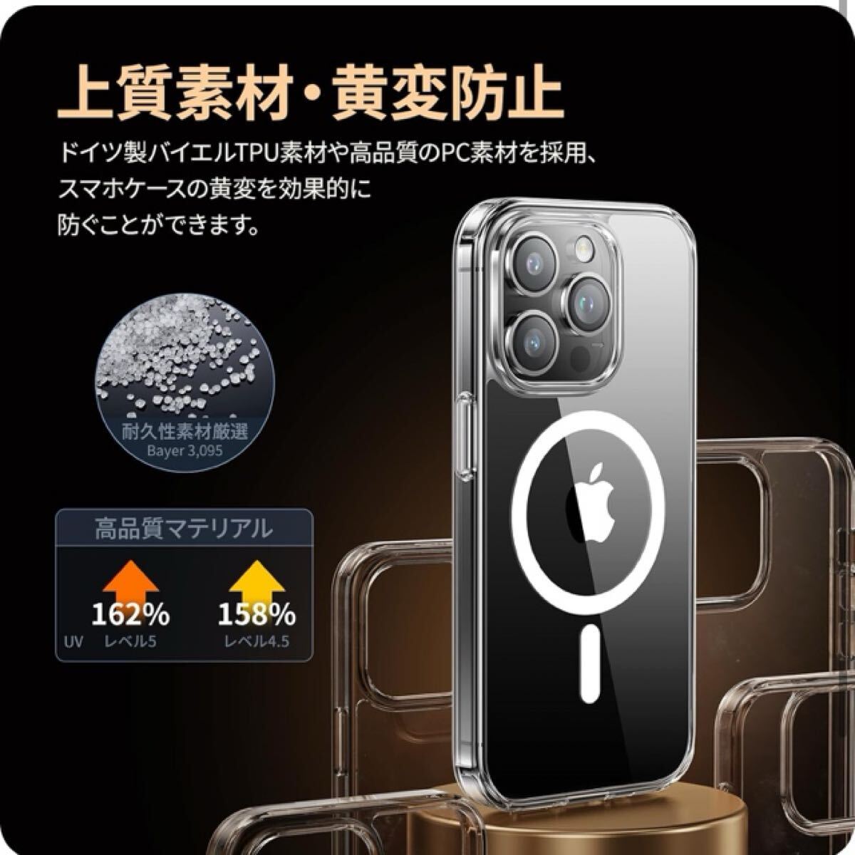 【MagSafe対応・黄変防止強化】スマホケース内部に38個の強力なN52マグネットを搭載しており、一瞬でピッタリと高速充電を実現!いくら振っても落ちないので、充電しながらゲームをやっても問題なし!また、ワイヤレス充電やモバイルバッテリー・車載ホルダー・スタンド・リングなど全てのMagSafe対応アクセサリーにもばっちり対応しています。背面は高透明度ポリカーボネートの素材で、スマホ本来の崇高な美しさと色をそのままに生かし、スマホ本体の高級感にも劣らない美しさです。ドイツ製バイエルTPU素材や高品質のPC素材を採用、TPU高分子にUV剤を添加し、黄変防止レベルは4.5級を獲得。スマホを長時間使用しても光沢感、透明感を保つことができます!