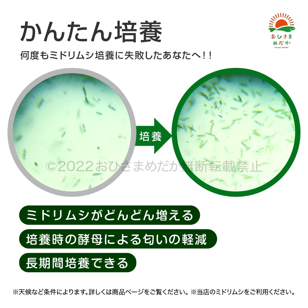 ミドリムシは水の中を浮遊し、増殖するのでいつでも食べれる餌になります。