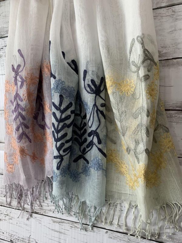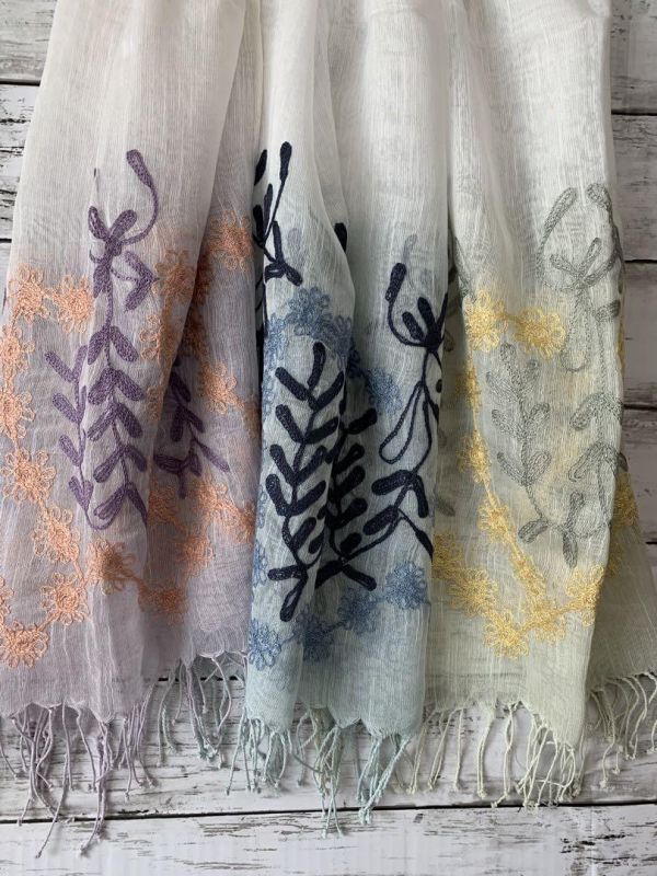 カラー...ブルー系 柄・デザイン...花柄 素材 シルク20% コットン80% サイズ 40×180㎝ インドシルクとコットンのストールです。 薄手の生地に花柄のアリ刺繍が施されています。涼しく肌触り良く春夏向けのストールです。 アリ刺が施された繊細で美しいストールは自分用はもちろんギフトにもおすすめです。 グリーン系 ブルー系 パープル系の3色あり、こちらはグリーン系です。 ●アリ刺繍はカシミール地方で発展し、春を感じさせる草花模様が美しい刺繍技法です。最大の特徴は「チェーンステッチ」と呼ばれる縫製方法で、裏側から見ると鎖のように見えます。特殊なアリ針を用い、1針ごとに1〜2ミリと細かく刺繍を進めるため、大きな作品は数ヶ月かかることもあります。手間をかけた繊細で温かみのあるデザインが魅力です ●インド綿は、ふんわり柔らかい肌触りと通気性の良さが特徴です。吸湿性が高く、汗ばむ季節も快適に過ごせます。軽やかで自然な風合いが魅力で、洗うほどに馴染むため、日常使いに最適です。 ●インドシルク製品は、上品な光沢と滑らかな肌触りが特徴です。通気性が良く、軽やかで快適な着心地を提供します。繊細な手織りや美しい染色が魅力で、エレガントな装いに最適です。 | ||