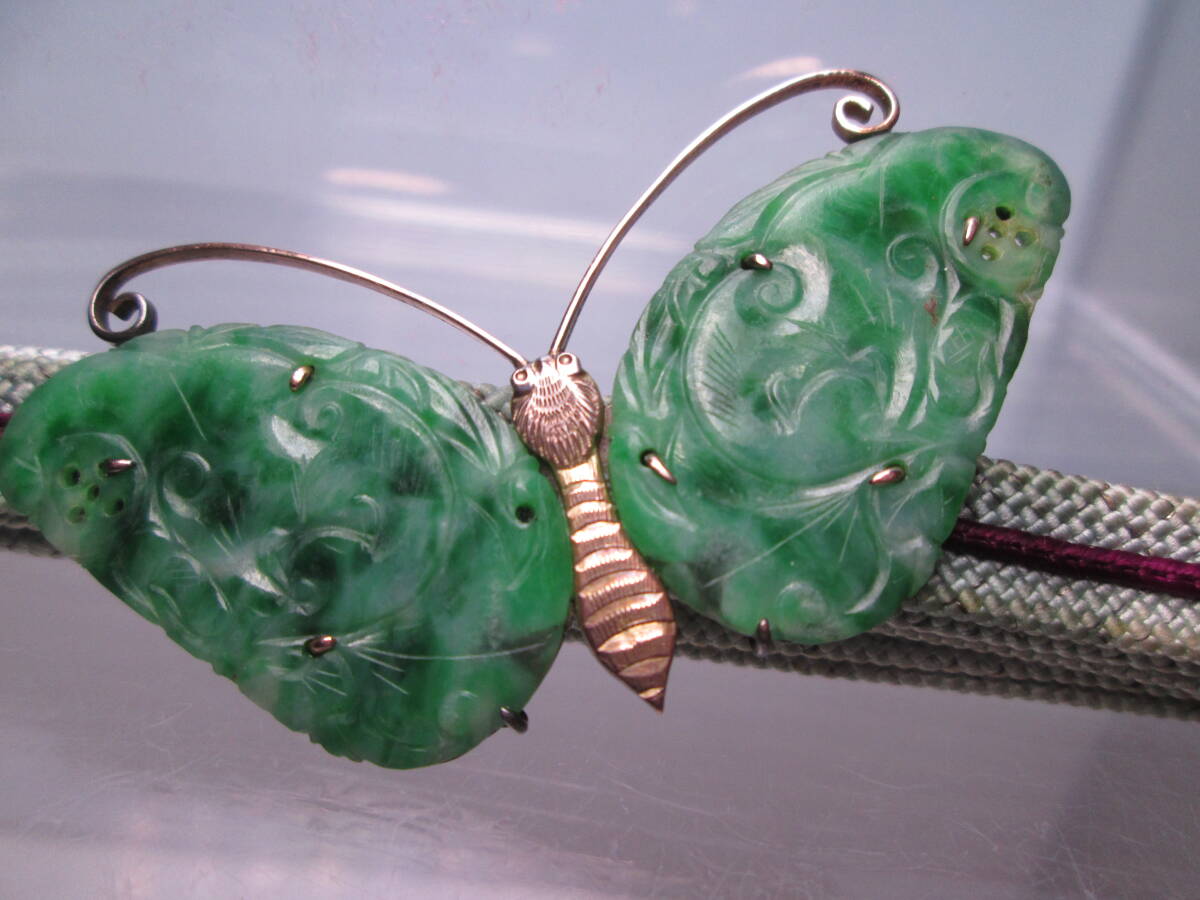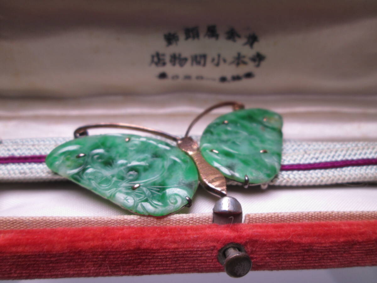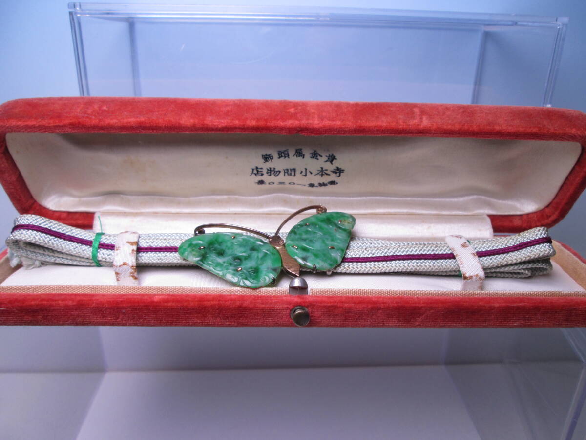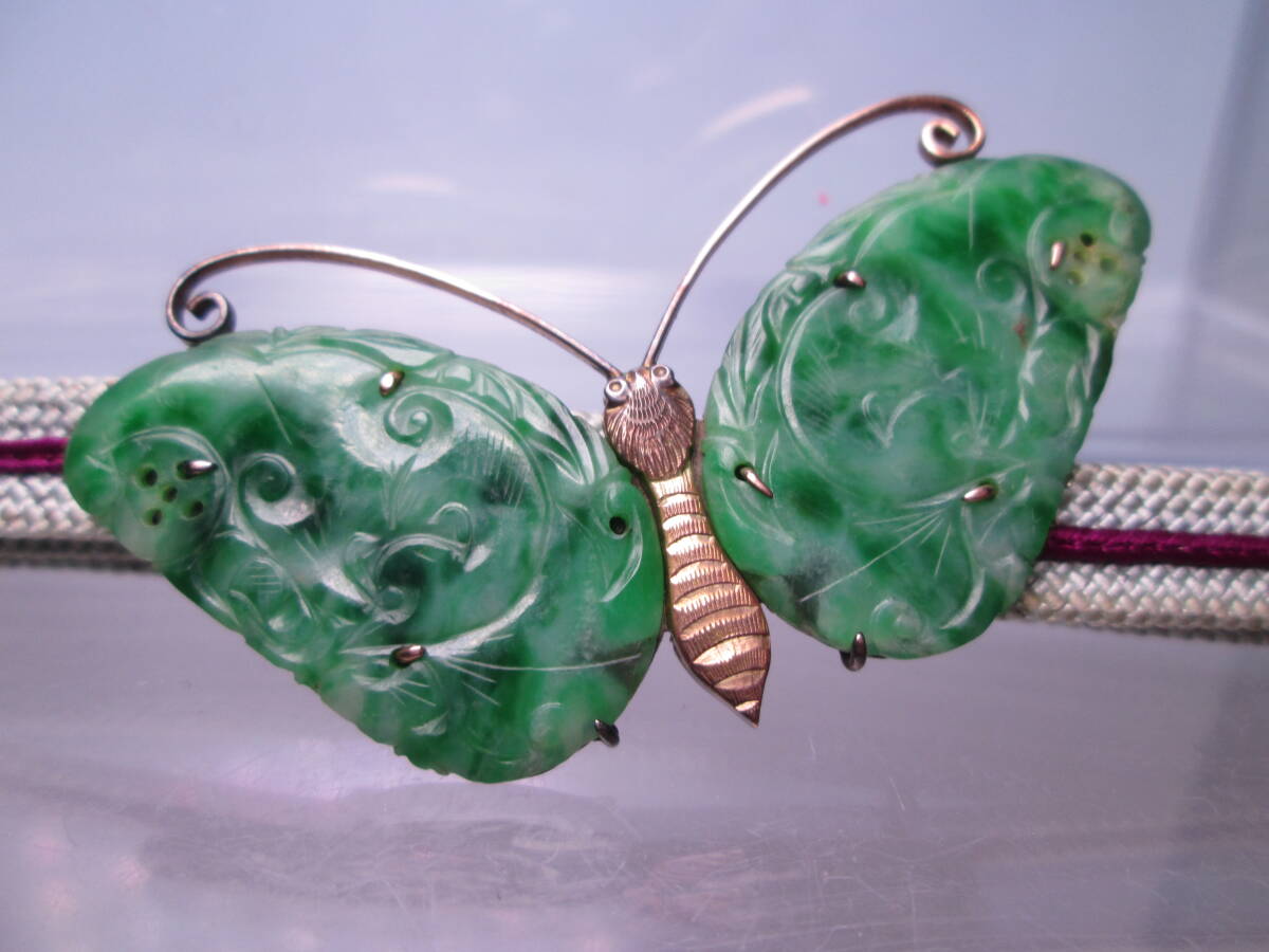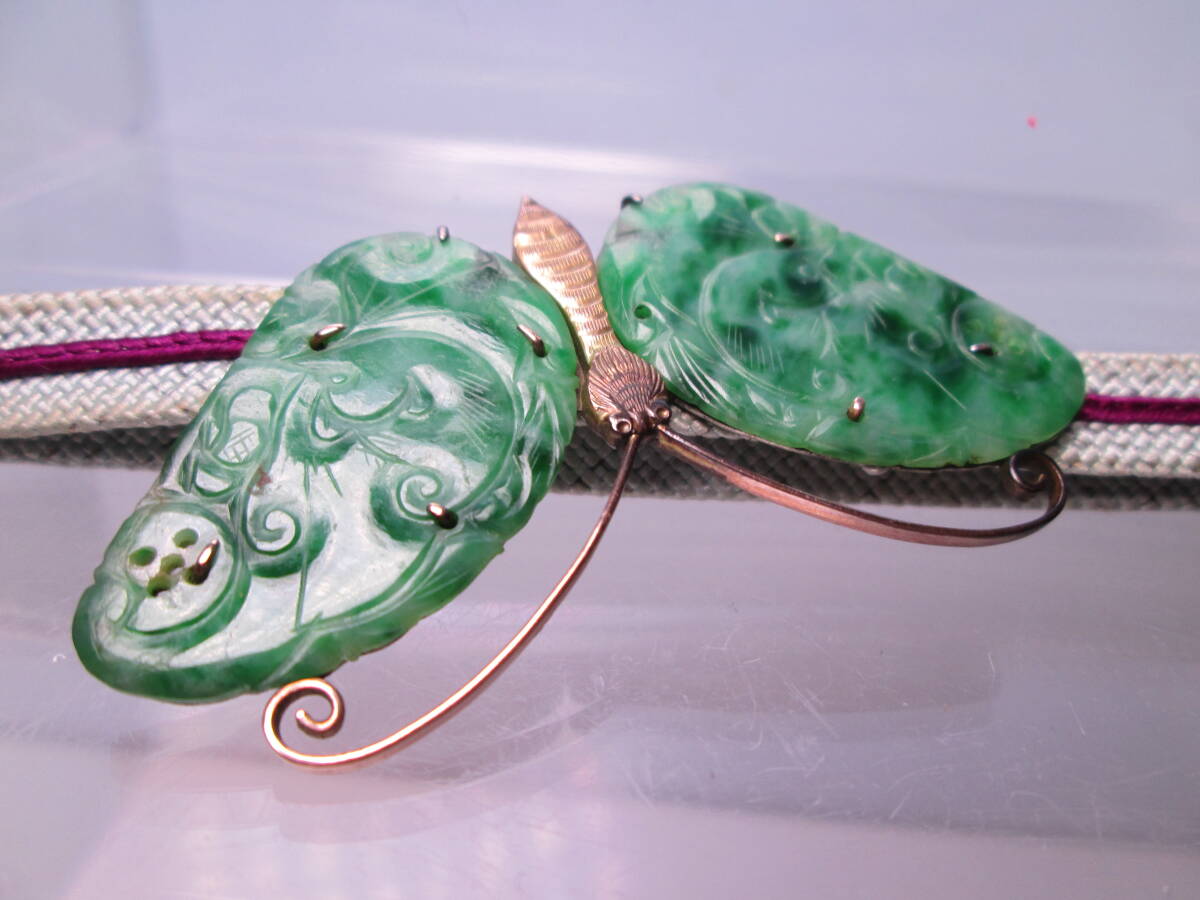 【江月】アンティーク・本翡翠 美しい蝶の帯留め 共ケース付