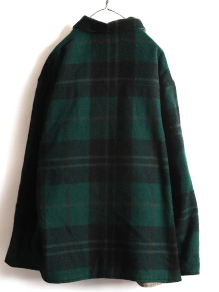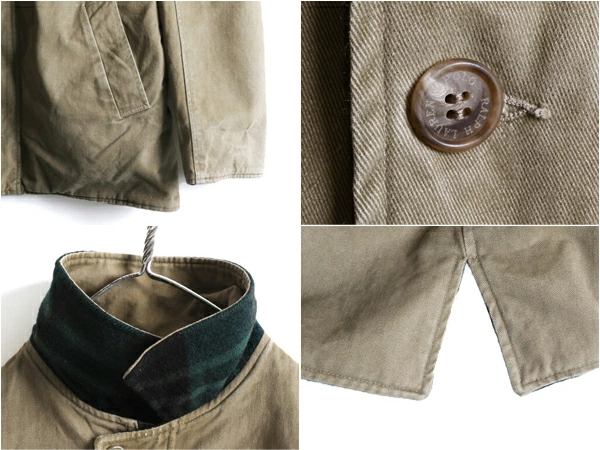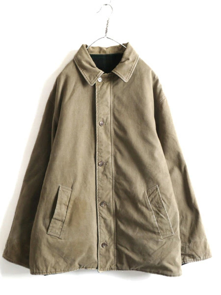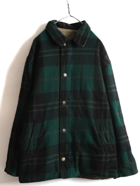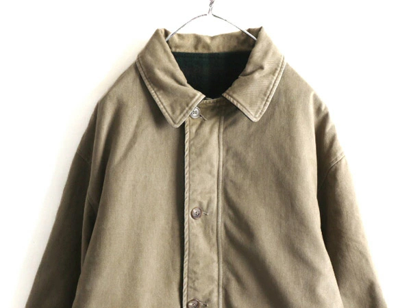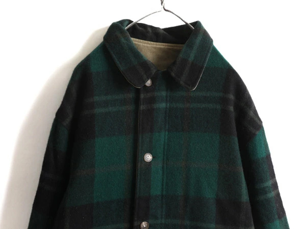 90年代のオールド 人気ブランド POLO RALPH LAURENの ウール × コットン リバーシブル ジャケットです。 素材は、SHELL:85% WOOL・15% NYLON ( メルトン ウール ) 肉厚な確りと目の詰まったヘビーウール素材を使用 保温性、防寒性もしっかりありますが 重さはそれほどでもなく、肩が凝る感じではありません。 REVERSE SHELL:100% COTTON (コットン チノ) 裏面は、レイヤーもしやすいコットンツイル素材 希少な、MADE IN USA ( アメリカ製 ) フロントは、本革レザートップ付きYKKジッパーを使用 両面、両サイドにハンドウォーマーポケット付き 雰囲気の良いグリーン×ブラックベースの好配色、 マルチカラーチェック面と、シンプルで合わせやすいカーキ、無地 両面楽しめるリバーシブルタイプ ラルフローレンらしい しっかりと作りこまれた、長く愛用できる商品です。 |