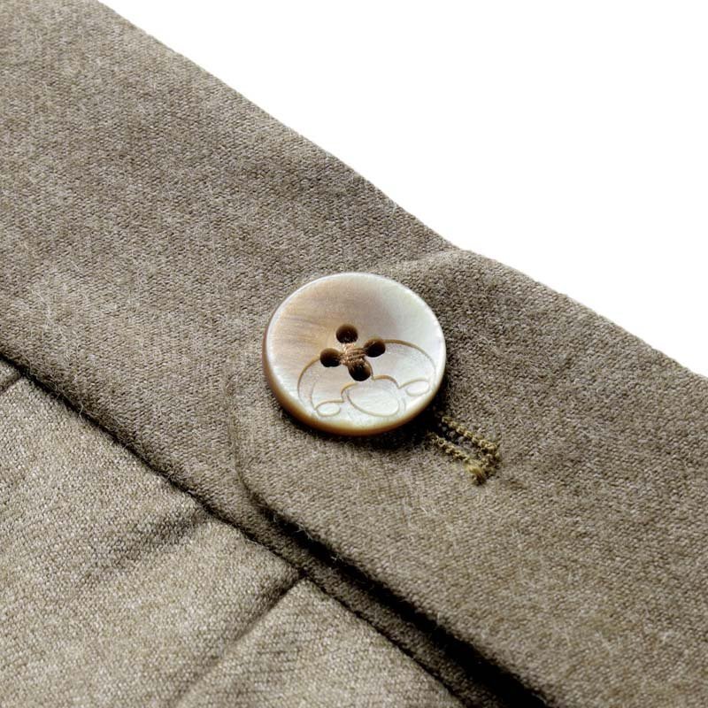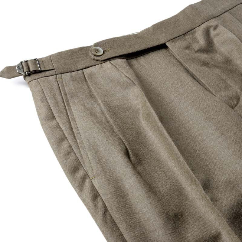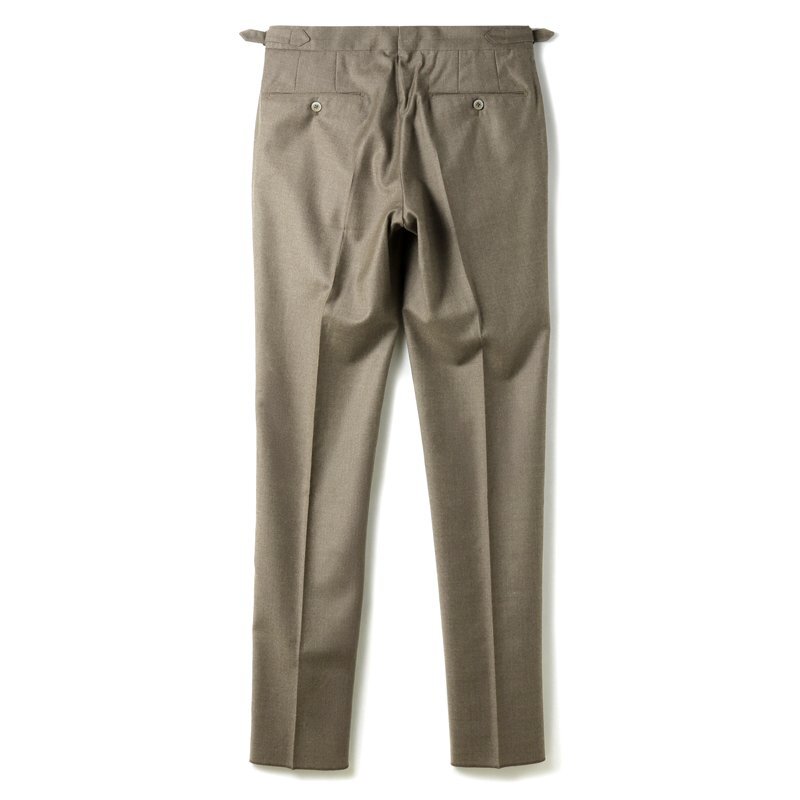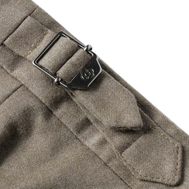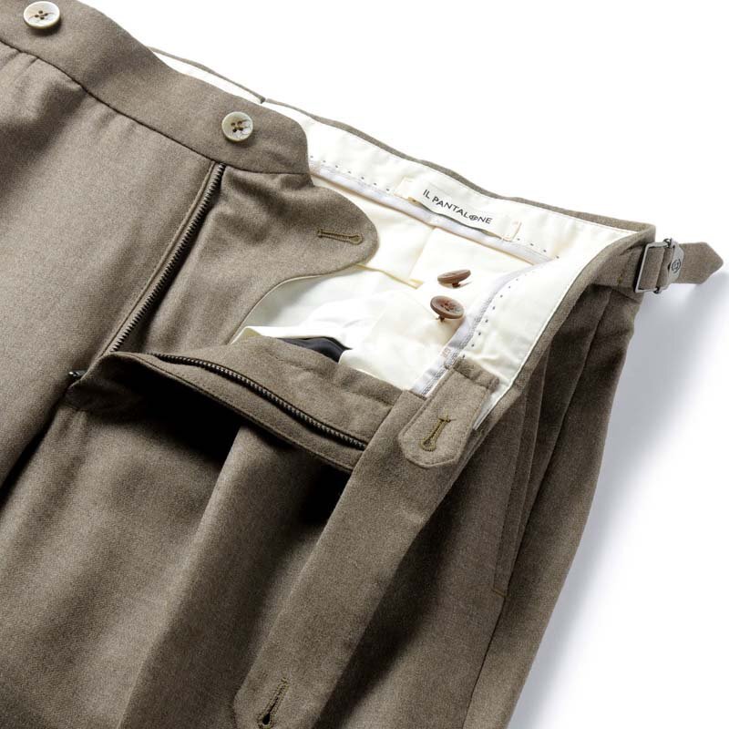 ・2プリーツ(アウトプリーツ)、長めの持ち出し、サイドアジャスター付きのベルトレス仕様といった、クラシックなムード漂うデザインが特徴。