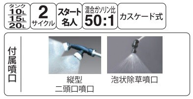 吐出量 | 縦型二頭口噴口使用 2L/分 | 縦型二頭口噴口使用 2L/分 カバー付泡状除草噴口使用 0.8L/分 | |||||||||||||||||