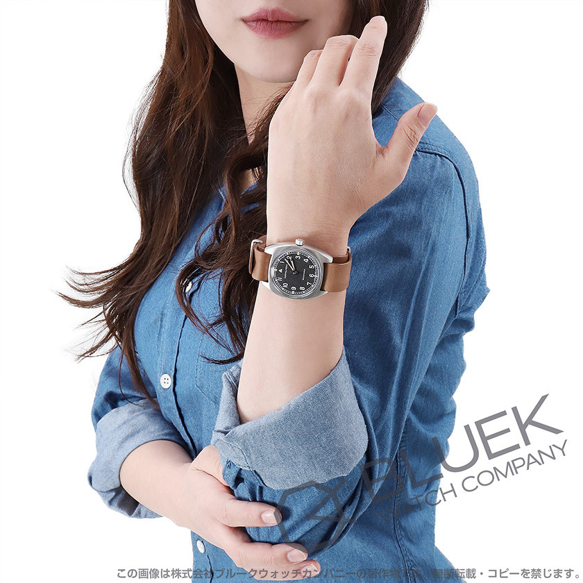 艶なしのシルバーステンレスケース・艶なしのシルバーステンレスベゼル・ブラック文字盤・蛍光塗料を施したシルバーの指針・アラビアインデックス・12時位置にブランドロゴ・ブラウンの革ベルト・穴留め式バックル・腕周り調整は約6mm幅の間隔で9段階可能・バックル部分、裏蓋にブランドロゴ 【入荷時期によりバックルの仕様、もしくは裏蓋の防水表記が異なる場合が御座います】 |