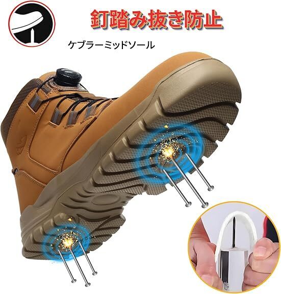 【つま先保護と釘踏み抜き防止】作業靴のつま先部分には、EUの標準認証を受けた良質な鋼先芯が含まれており、危険な作業場でブレードや重量物の衝突から足を保護することができます。作業靴には頑丈なケブラーミッドソールが付いており、穿刺防止性能に優れており、尖った物体が靴底に突き刺さるのを防ぐことができます。