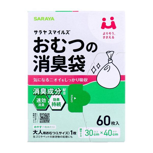気になるニオイをしっかり吸収 悪臭成分をキャッチして化学的に消臭 消臭成分を練りこんだポリ袋です アンモニアなどの排泄物の悪臭成分を化学的に取り除きます 速効性持続性に優れています ※使用期間の長さや内容物の量によって効果には差があります 大人や赤ちゃん用の使用済みおむつはもちろん生ゴミやペットの排泄物の処理にもお使いいただけます 目安(1枚あたり):大人用おむつ(Lサイズ)1枚 【商品詳細】 寸法:300mm(ヨコ)X400mm(タテ)X0.017mm(厚さ) 個装サイズ:120mmX165mmX50mm 個装重量:約270g 内容量:60枚入 原料樹脂:ポリエチレン 耐冷温度:マイナス30度 製造国:ベトナム 発売元:サラヤ株式会社 JANコード:4973512449956 |
