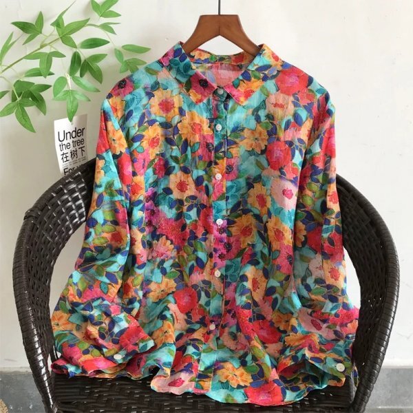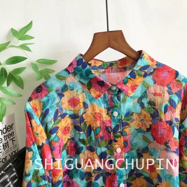 sg プリント花柄 フリーサイズ ワイシャツ チュニック トップス 麻100% 大人可愛 ナチュラル 花柄122