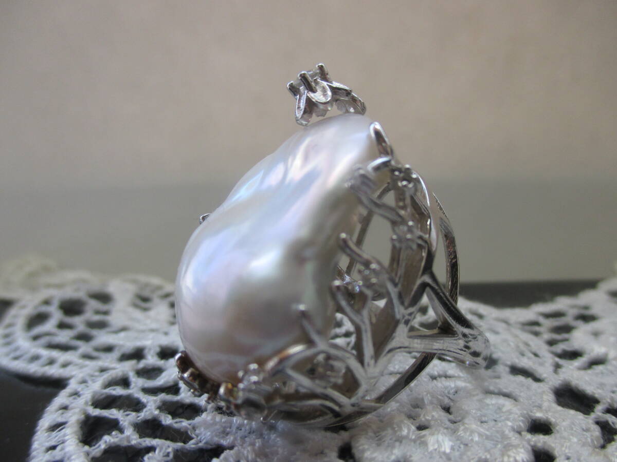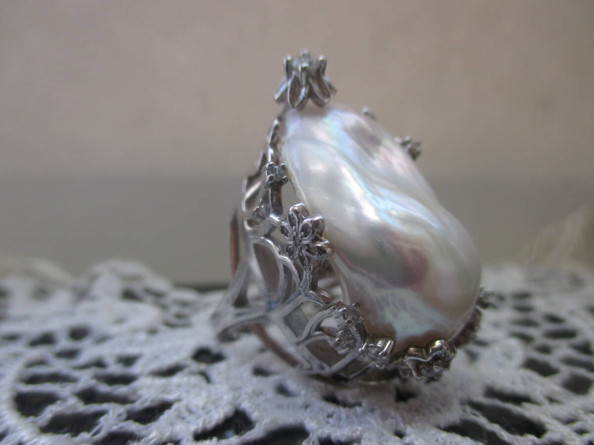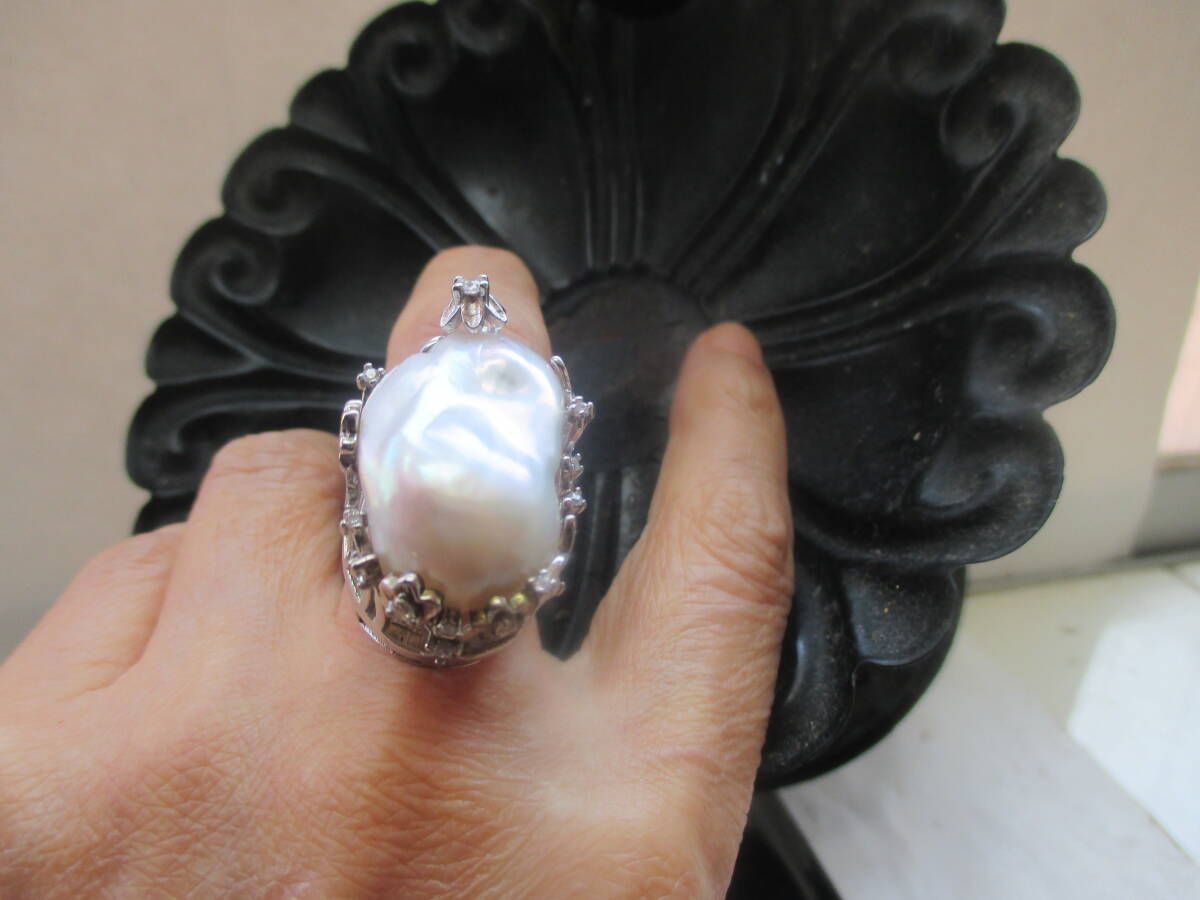 新品★銀925細工!南洋ジャンボバロックホワイト★CZ22個!も^フェミニンなパールリング^調節可能 アガット好きにも