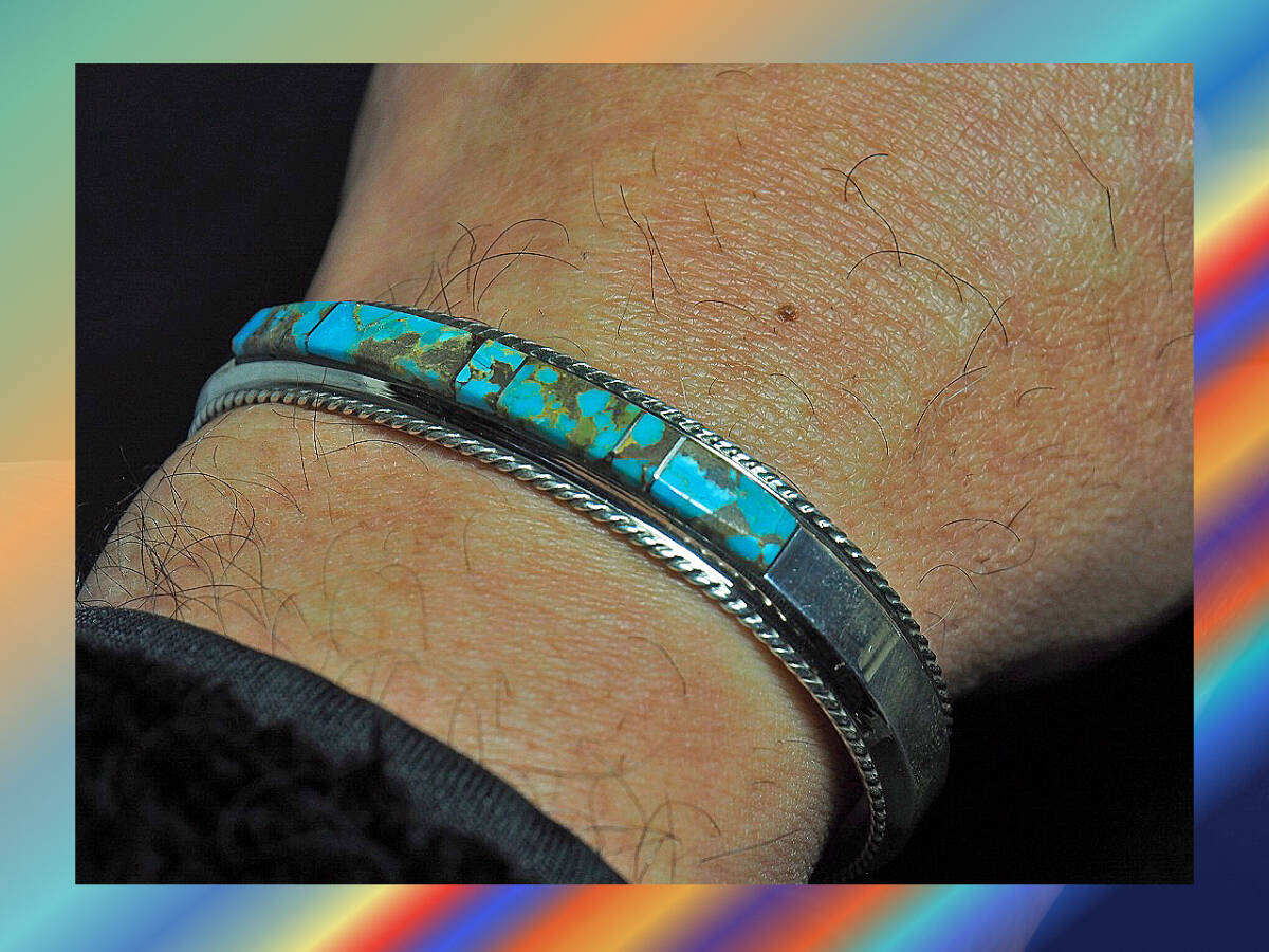 質感有るシルバーの地金に精密にカットしたキングマン鉱山産出のターコイズを組み合わせた洗練され得た存在感を放つバングルで、裏面には作家のイニシャルと素材の刻印があり、身に付けるだけで、ワイルドでネイティブな雰囲気をまとえます。