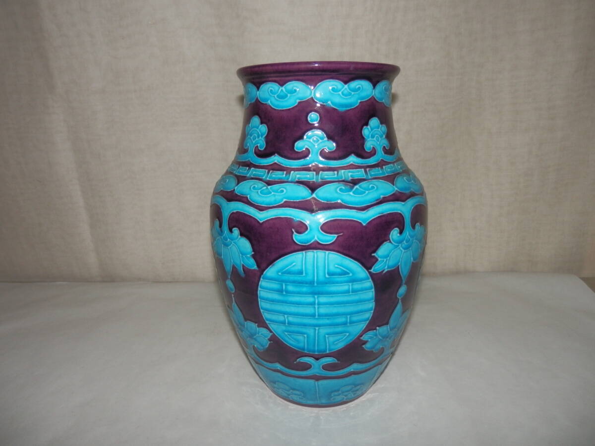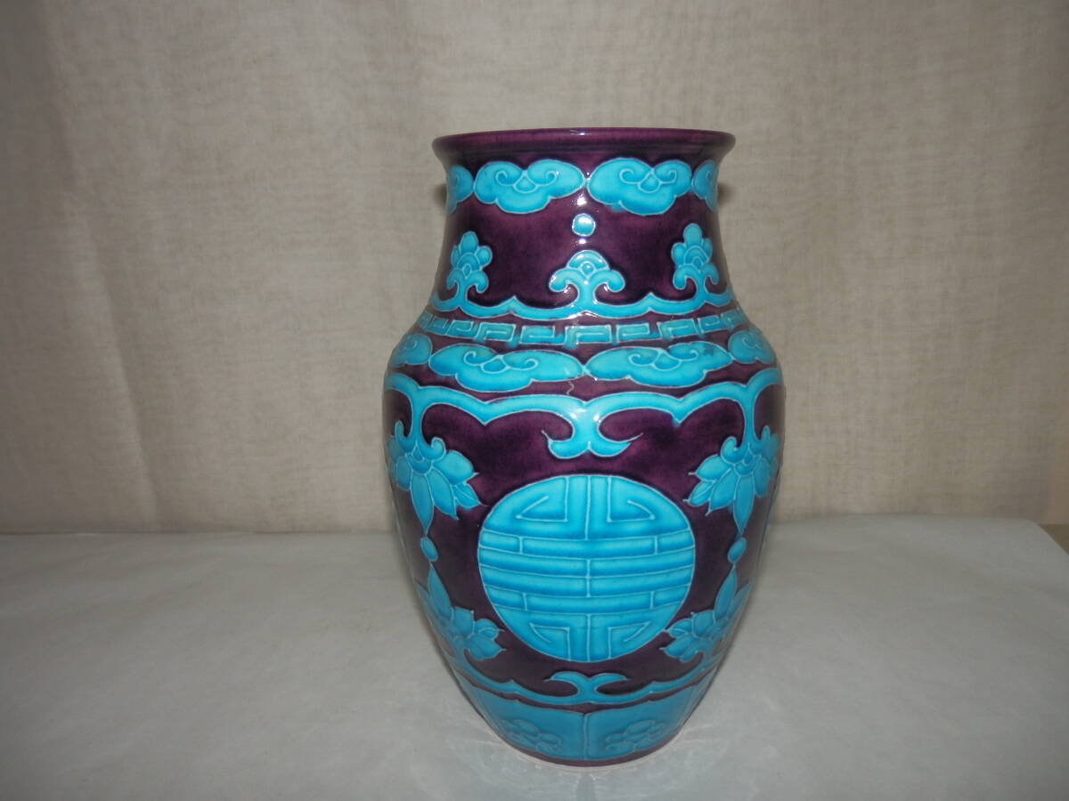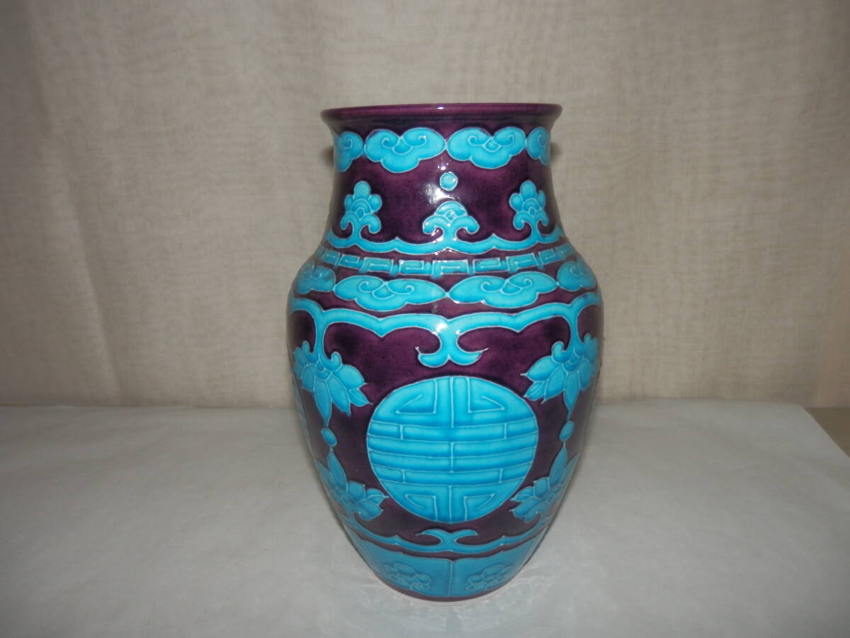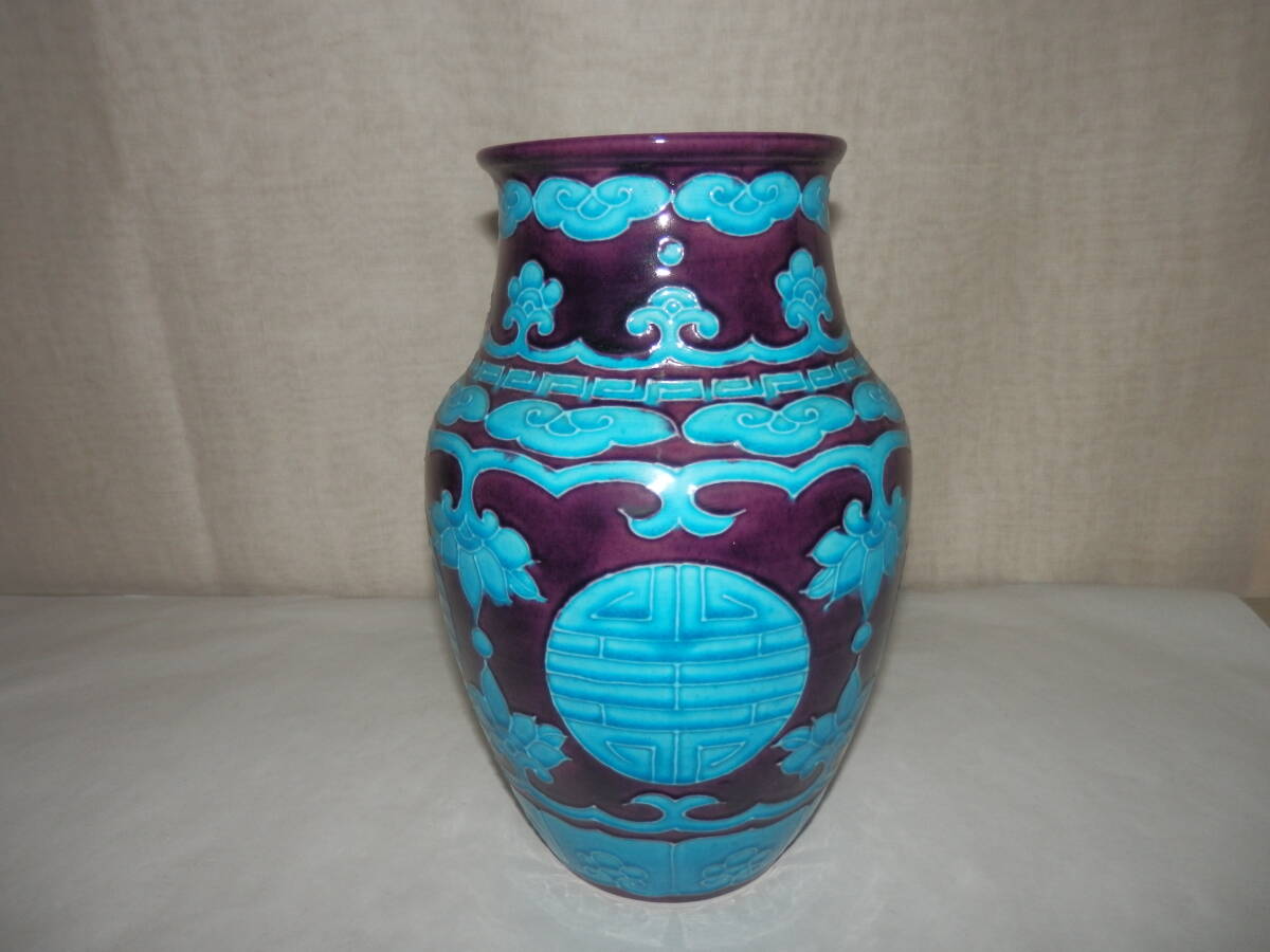「中古品・茶道具」南紀瑞雲(津田瑞雲)さんの紫交趾の寿字文の花瓶です。紀州御庭焼の偕楽園写です。 上部外径約11.2cm 高さ約24.3cm 底に印有。 箱無。 どうぞ宜しく。【南紀瑞雲(津田瑞雲)】作 紀州御庭焼 偕楽園模紫交趾寿字文花瓶