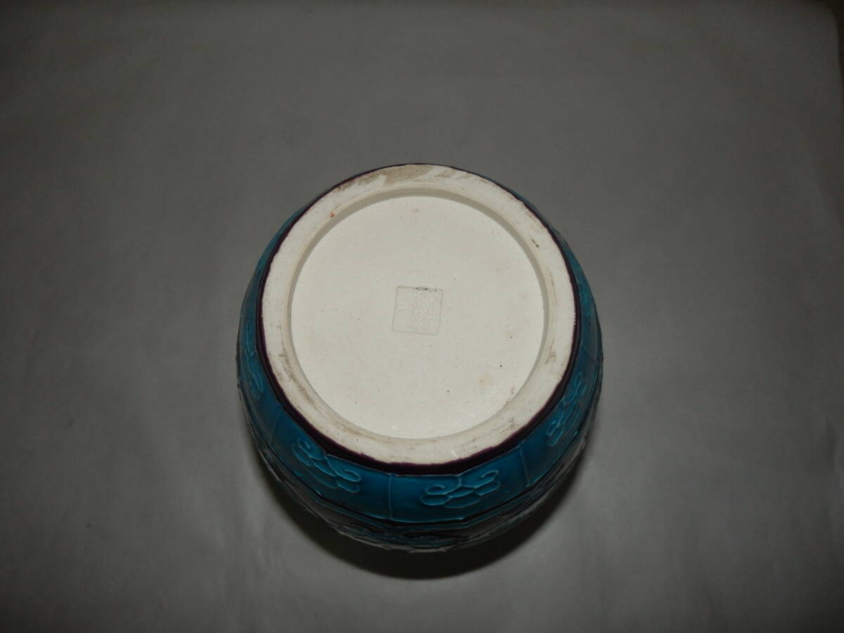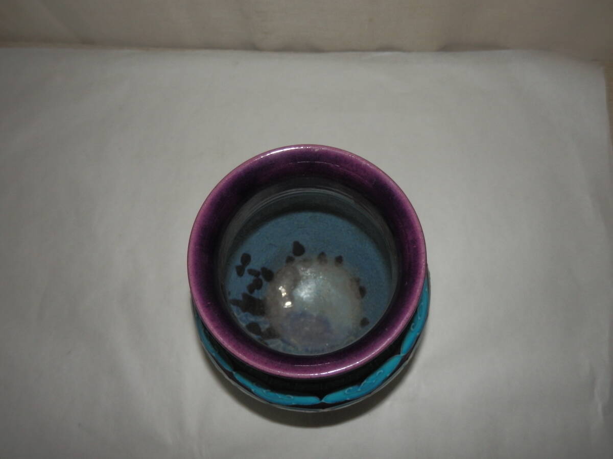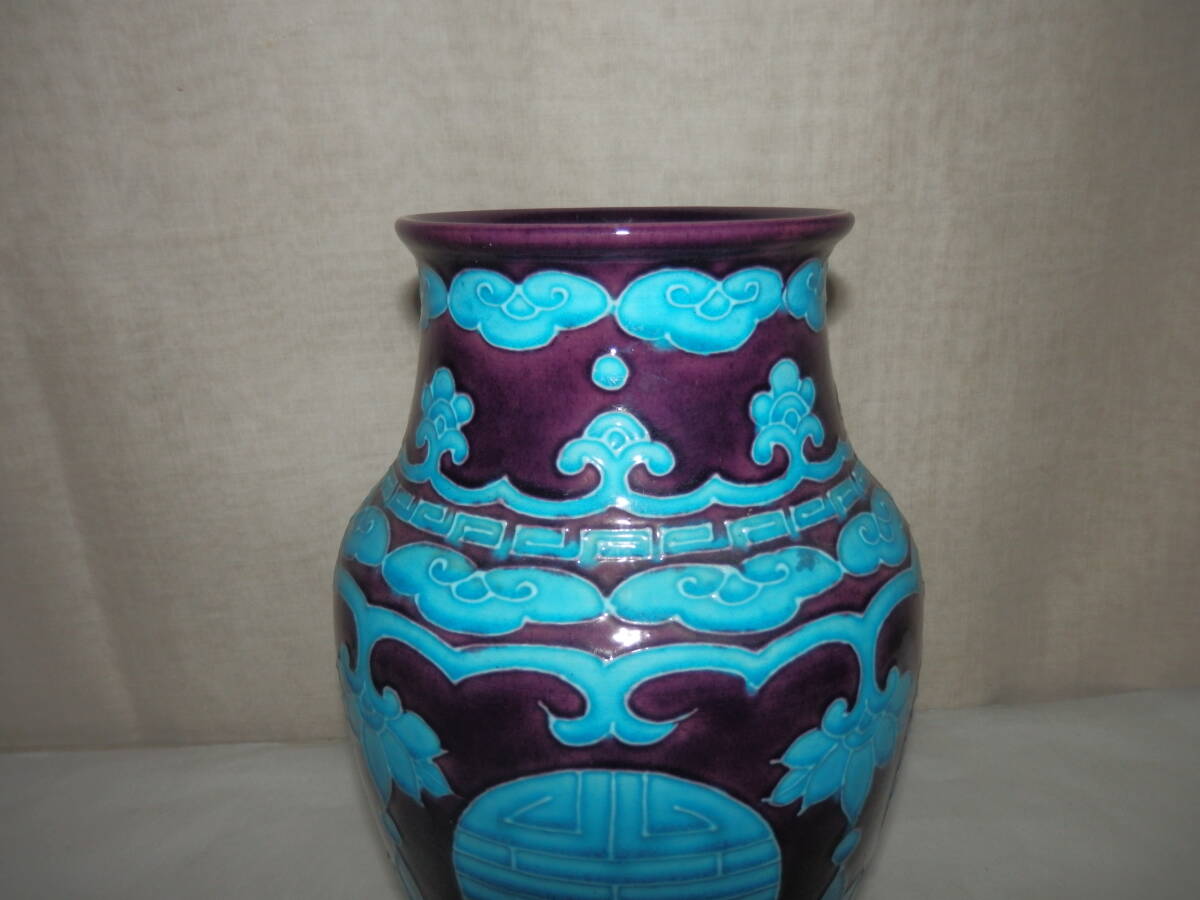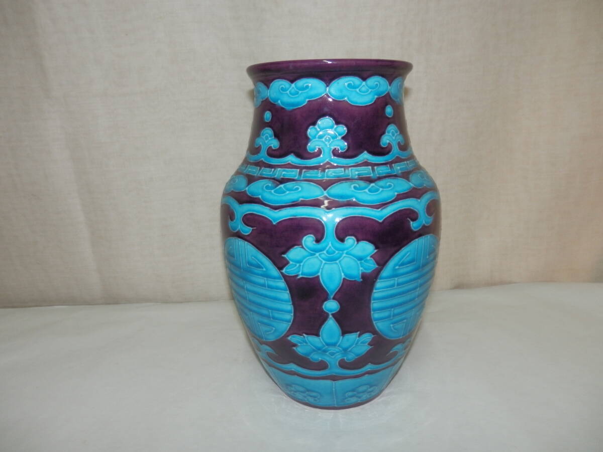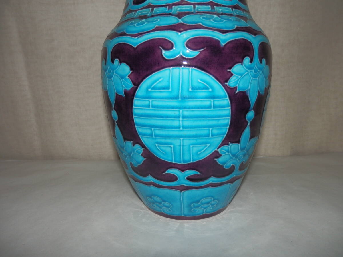 「中古品・茶道具」南紀瑞雲(津田瑞雲)さんの紫交趾の寿字文の花瓶です。紀州御庭焼の偕楽園写です。 上部外径約11.2cm 高さ約24.3cm 底に印有。 箱無。 どうぞ宜しく。【南紀瑞雲(津田瑞雲)】作 紀州御庭焼 偕楽園模紫交趾寿字文花瓶