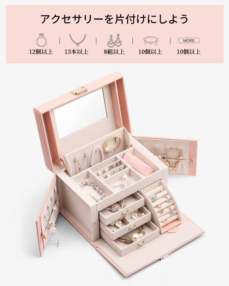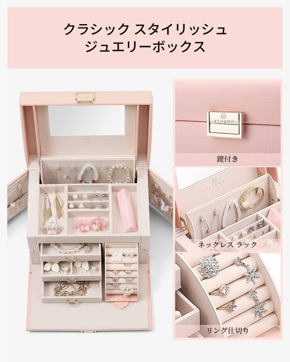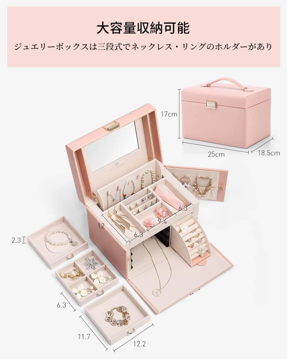 ジュエリーボックス アクセサリーケース ジュエリーバッグ 大容量の高級宝石箱 ピンク 収納 アクセサリー 鏡付き プレゼント