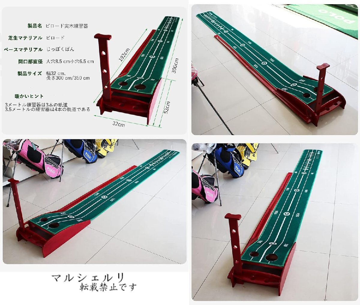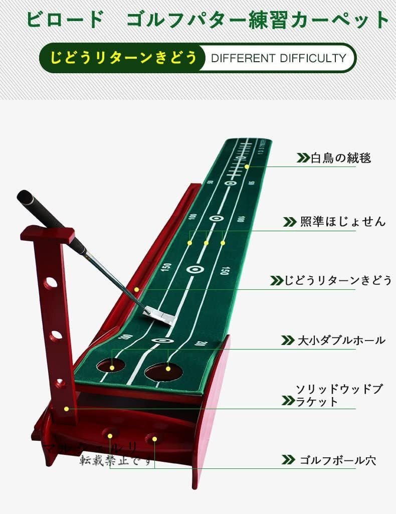 商品名:ビロードゴルフ練習用マット。マットサイズ:350cm、難易度の異なる練習が可能です。持ち運びやすくて、くるくる巻いてコンパクトに簡単収納。いつでもどこでも好きな場所で練習ができます。