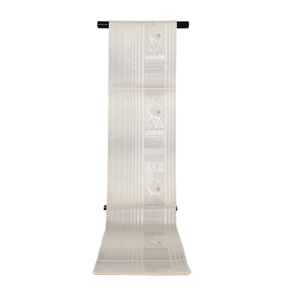 | 絽 西陣織袋帯 ベージュ・銀箔・緑暈し地 幾何模様・三角・丸 花柄 未使用品 仕立て上がり | |