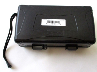 「黒のプラスティックケース。ポリウレタンで内装されているので葉巻にやさしい。保湿器付。」