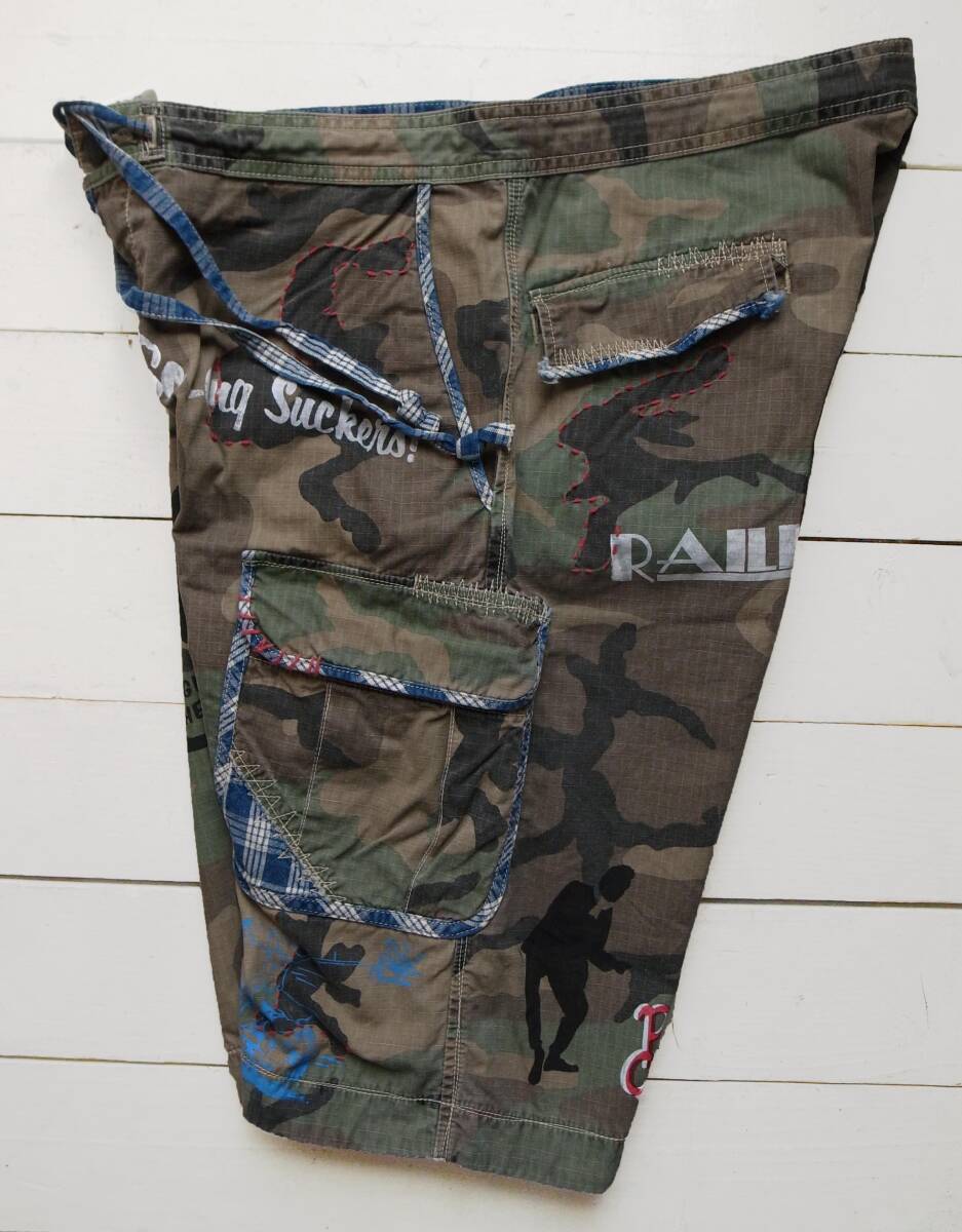 迷彩柄とチェック柄の生地を使い再構築したカーゴショートパンツです。