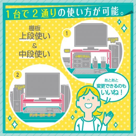 棚板の位置は上段・中段で変更が可能!その時の用途に合わせた棚の高さ・収納サイズで使用できます。