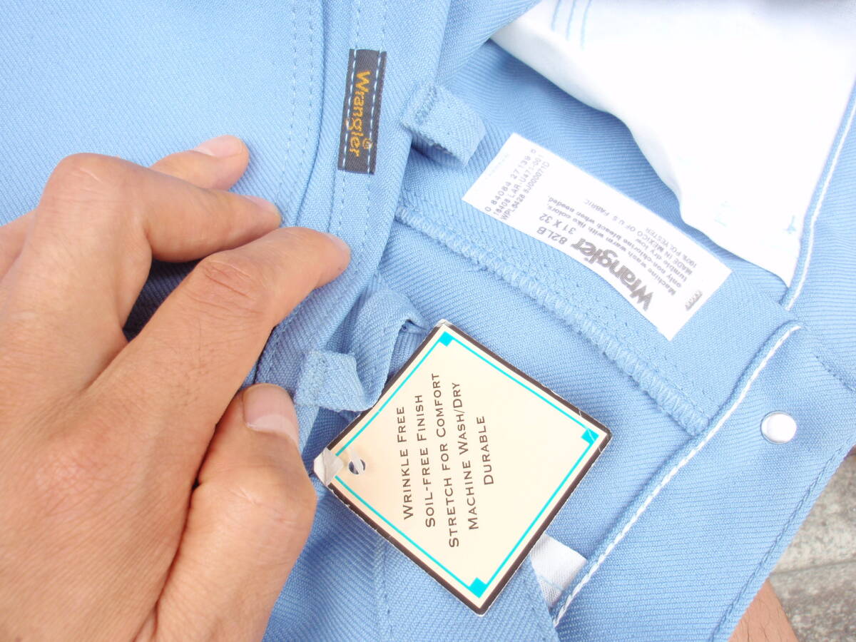 買ったけど使用しませんでしたが、右前ポケット下部に薄い汚れ部がありますのでご了承ください。それ以外は目立った汚れや傷は無く状態は良いです。ラングラーの青いスタプレ?仕様パンツになります。サイズは31×32表記で、実寸ではウエスト80センチ、レングス107センチ、股下82センチ位になります。正規品。