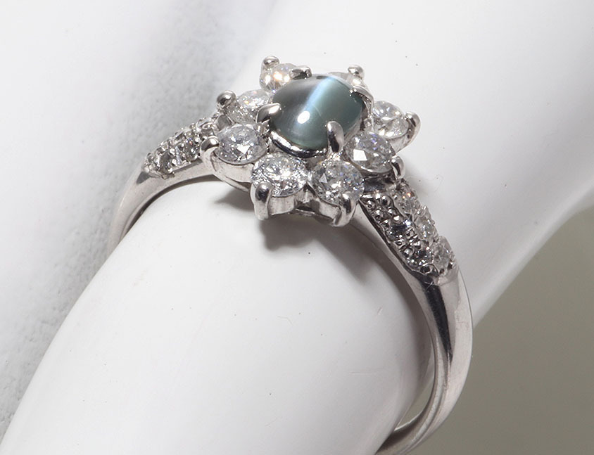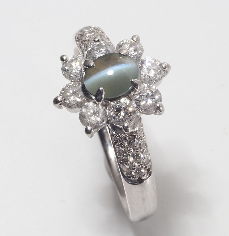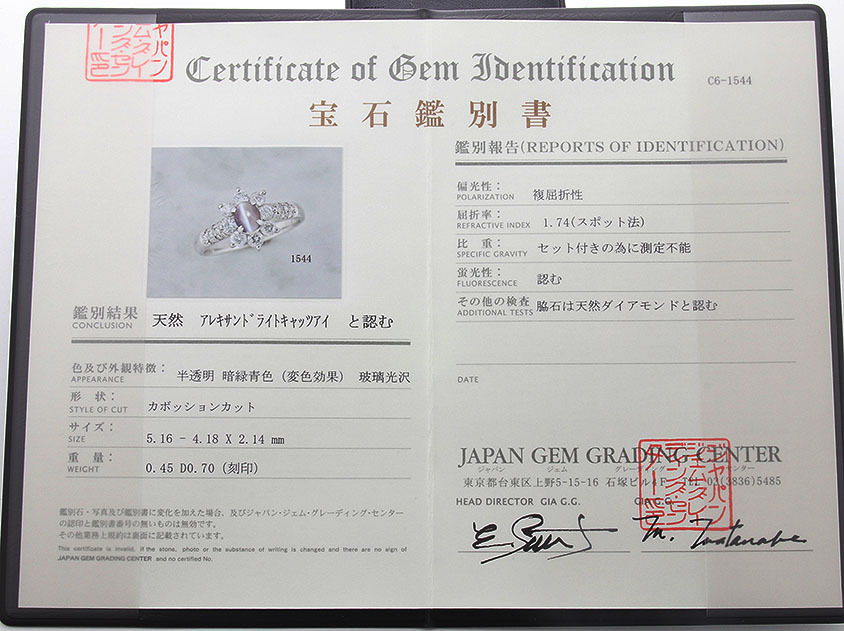 コメント | [[全ての商品に品質保証カードが付きますのでご安心ください]] JAPAN GEM GRADING CENTER社の鑑別書が付属しており、天然アレキサンドライトキャッツアイであることが証明されています。 暗緑青色(変色効果) の確認が取れています。5.3x4.2ミリと小さなものですがクオリティの高さから30万円を超える価格で購入された逸品です。9枚目に載せた写真はストロボではなく、タングステン照明で撮ったものです。カラーチェンジは人間の眼で見たときに感じられるもので、撮影では、完全再現ができないのです。 しかしながら、雰囲気だけは感じられると思ったので撮影しました。完全な色ではありませんので、ご了解ください。 |